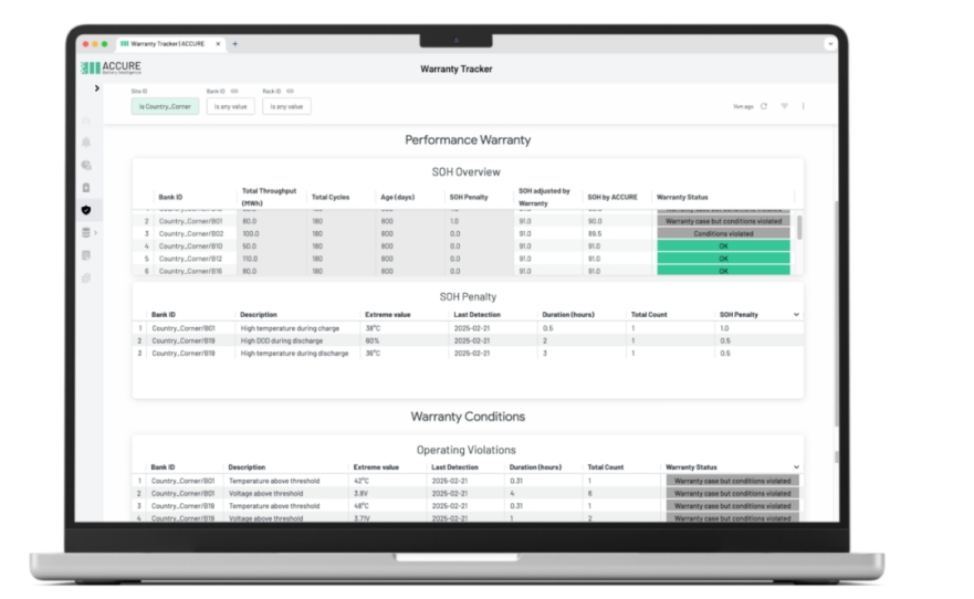 去年12月,ACCURE Battery Intelligence公司为其软件平台推出了一项新的预测分析功能——保修跟踪器,该功能可以通过运行数据持续监控电池储能系统。