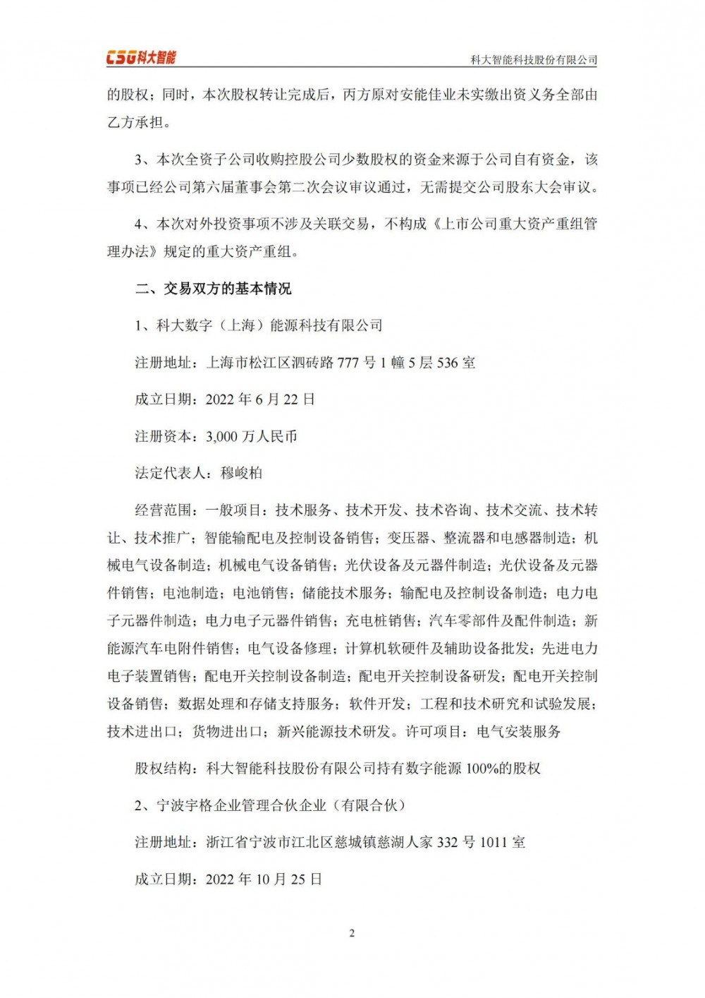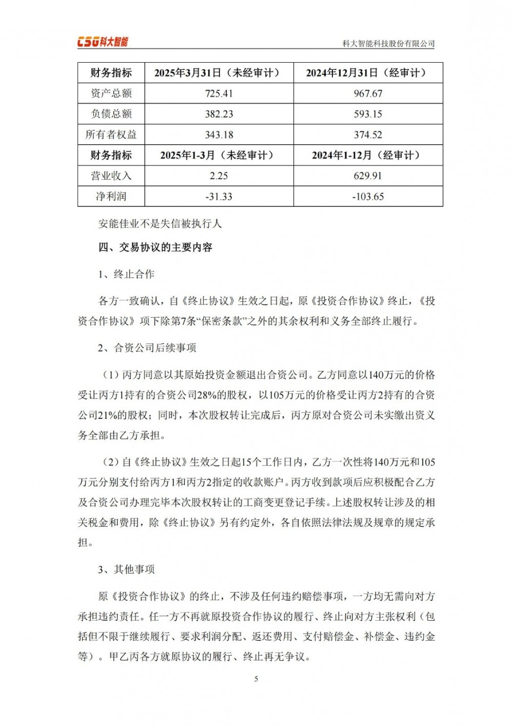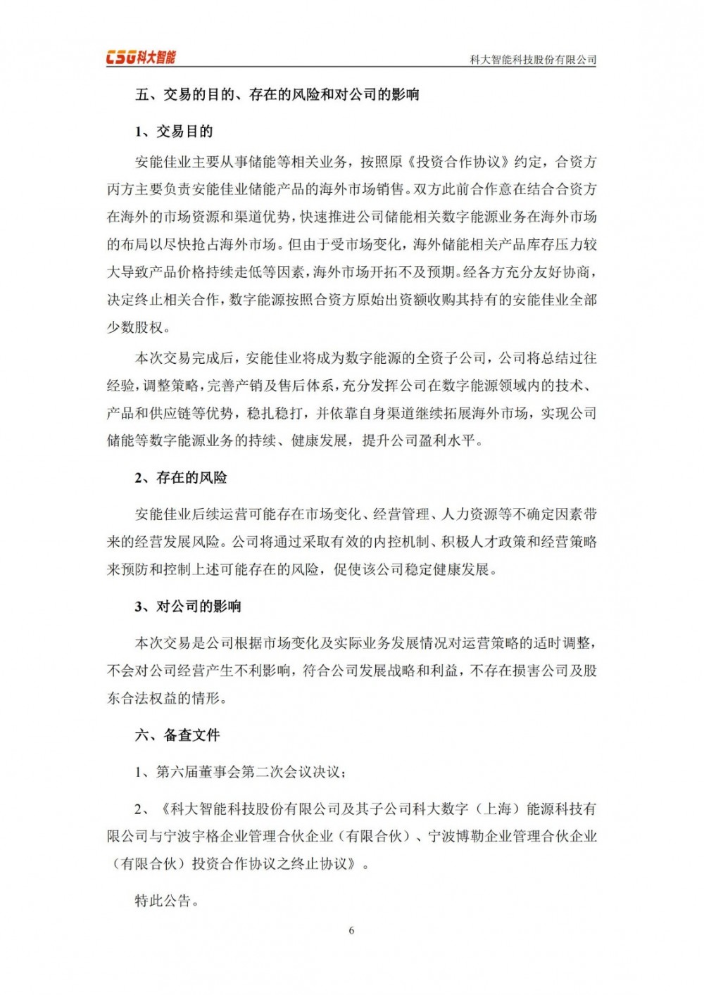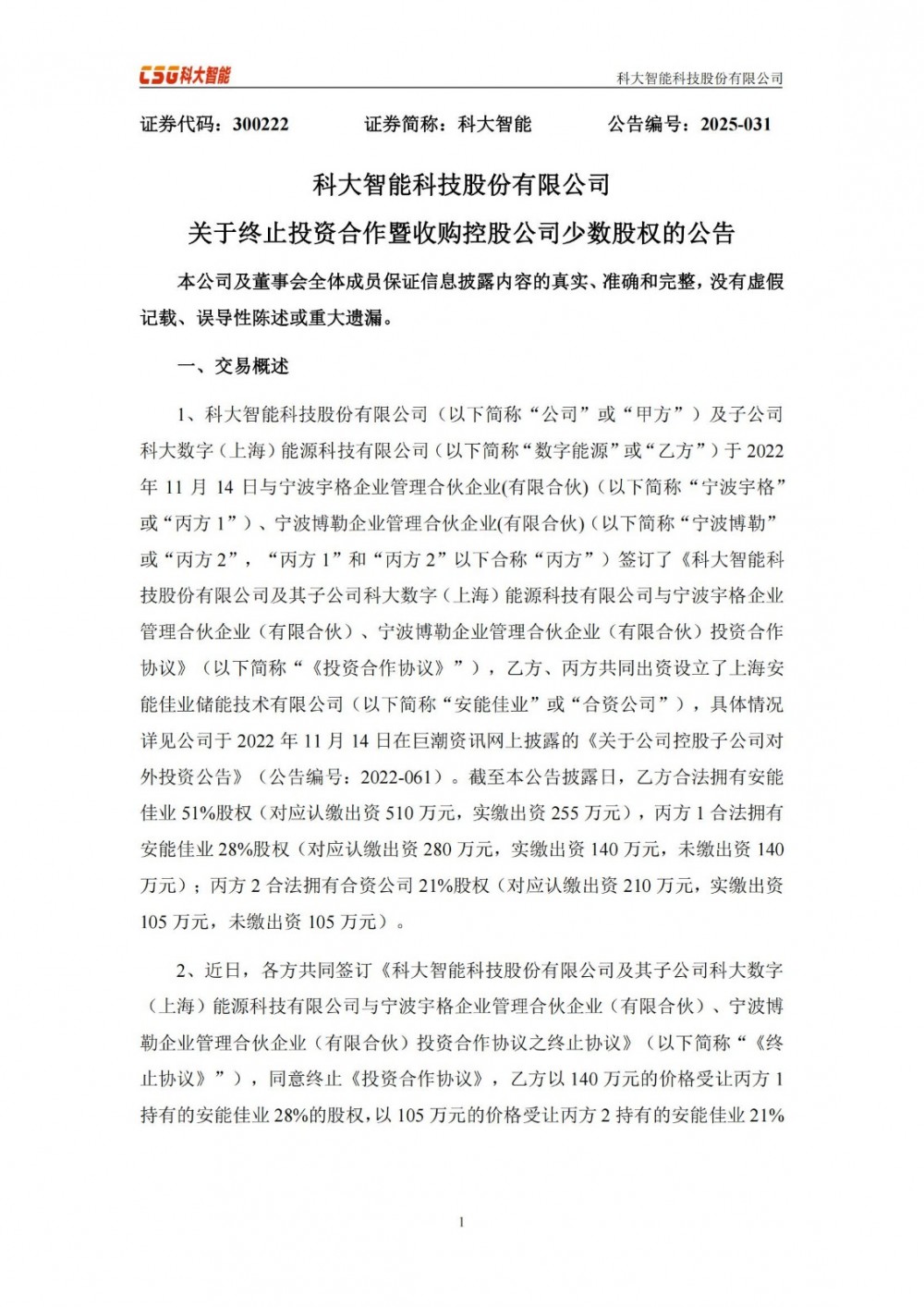 对于终止投资合作,科大智能表示,由于受市场变化,海外储能相关产品库存压力较大导致产品价格持续走低等因素,海外市场开拓不及预期。经各方充分友好协商,决定终止相关合作,数字能源按照合资方原始出资额收购其持有的安能佳业全部少数股权。