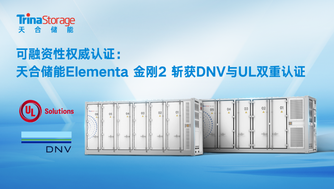 近日,天合储能Elementa 金刚2以其卓越的安全性、可靠性和可融资性,同时获得DNV和UL Solutions两大国际权威机构的认证。Elementa 金刚2针对海外不同的储能需求提供4MWh和5MWh两种配置方案,其创新设计和卓越性能获得评审机构高度认可。