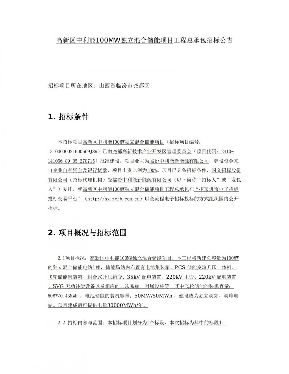 4月24日,临汾中利能新能源有限公司发布了高新区中利能100MW独立混合储能项目工程总承包招标公告。