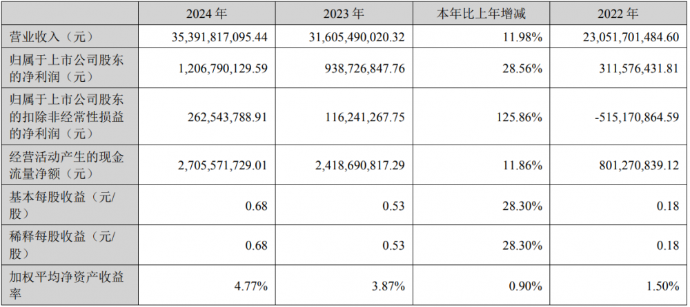 年报显示,报告期内,国轩高科实现营业收入3,539,181.71万元,同比上升11.98%;实现营业利润128,344.97万元,同比上升31.58%;实现利润总额126,310.97万元,同比上升33.22%;实现净利润115,413.42万元,同比上升19.09%,其中,实现归属于母公司所有者的净利润120,679.01万元,同比上升28.56%。