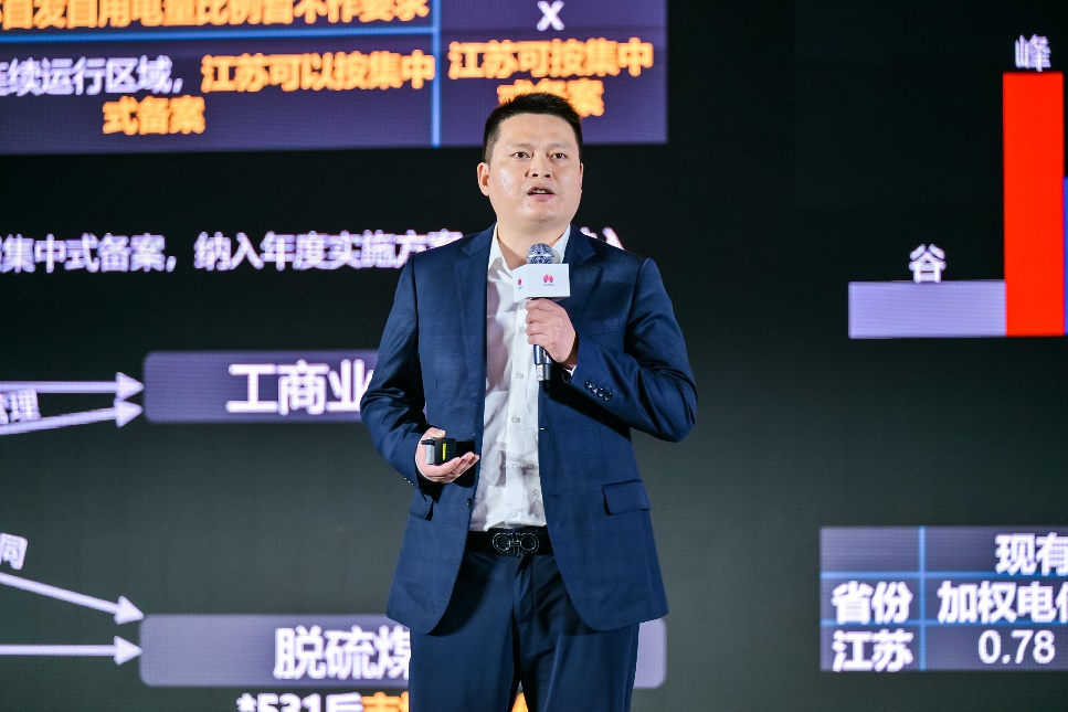 江苏华电能源销售有限公司总经理夏炜,华为数字能源为武澄科技园提供全套解决方案,预计每年可生产绿电170万度,光储协同基本达到100%自发自用,充电桩年耗电约80万度,绿电解决40%用电,二氧化碳减排40吨,成功帮助园区缓解降碳压力;同时度电成本更优,通过AI加持提升10%综合收益,降低园区用能成本。
