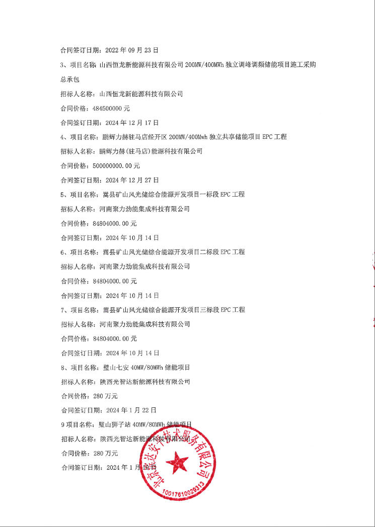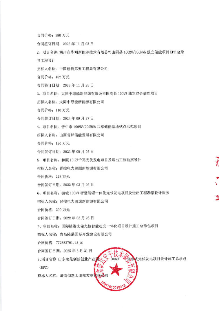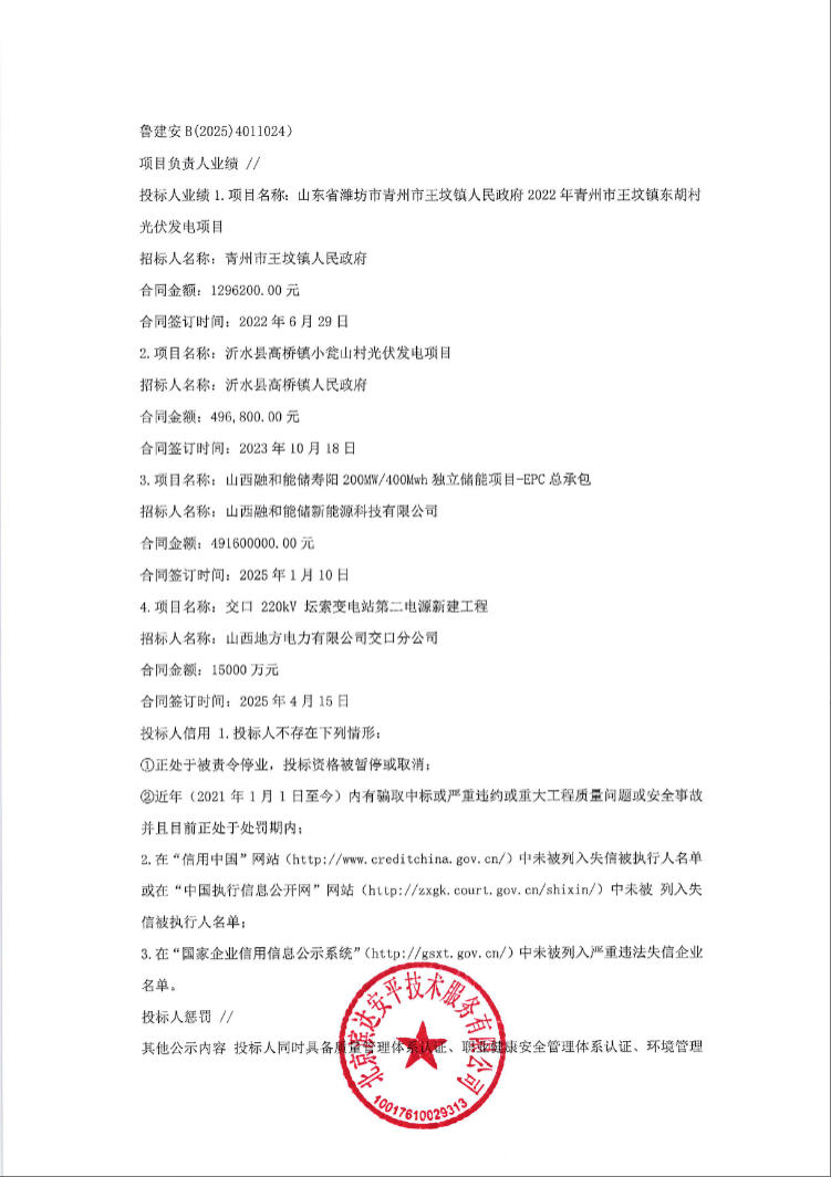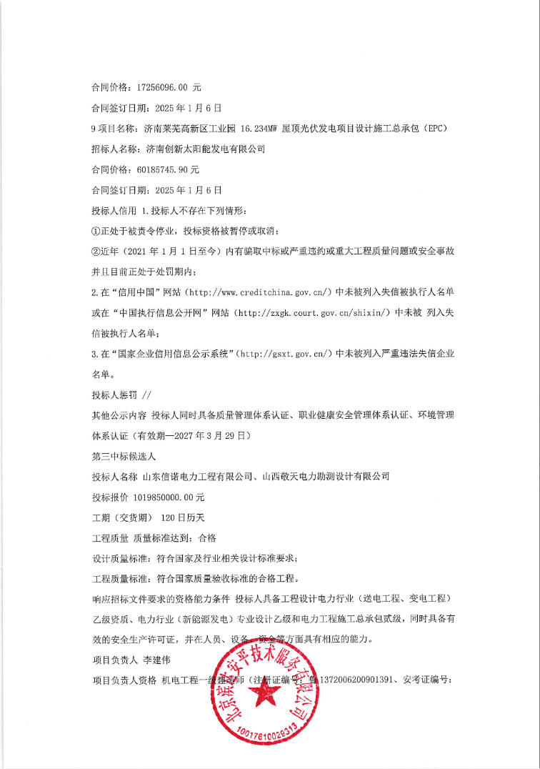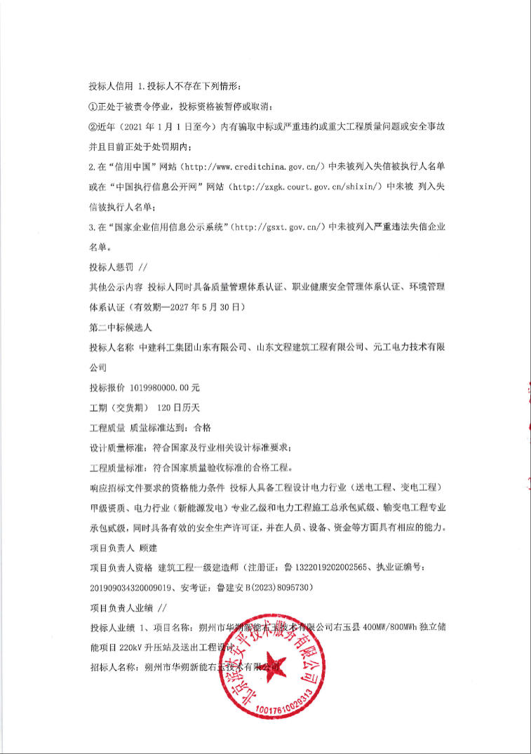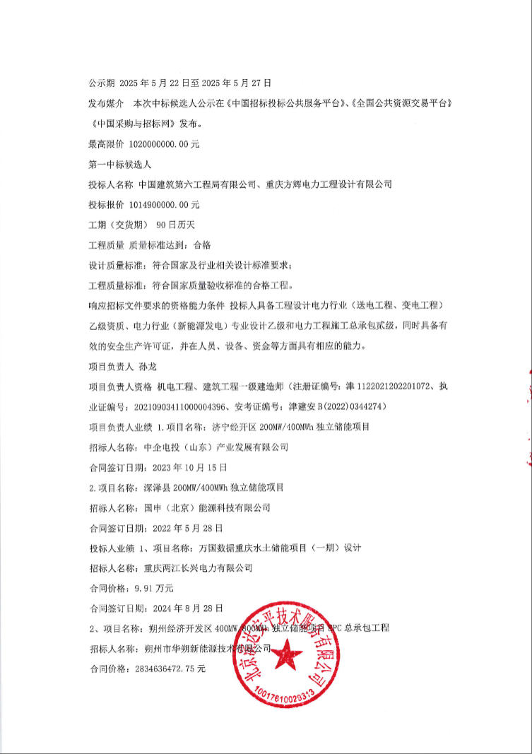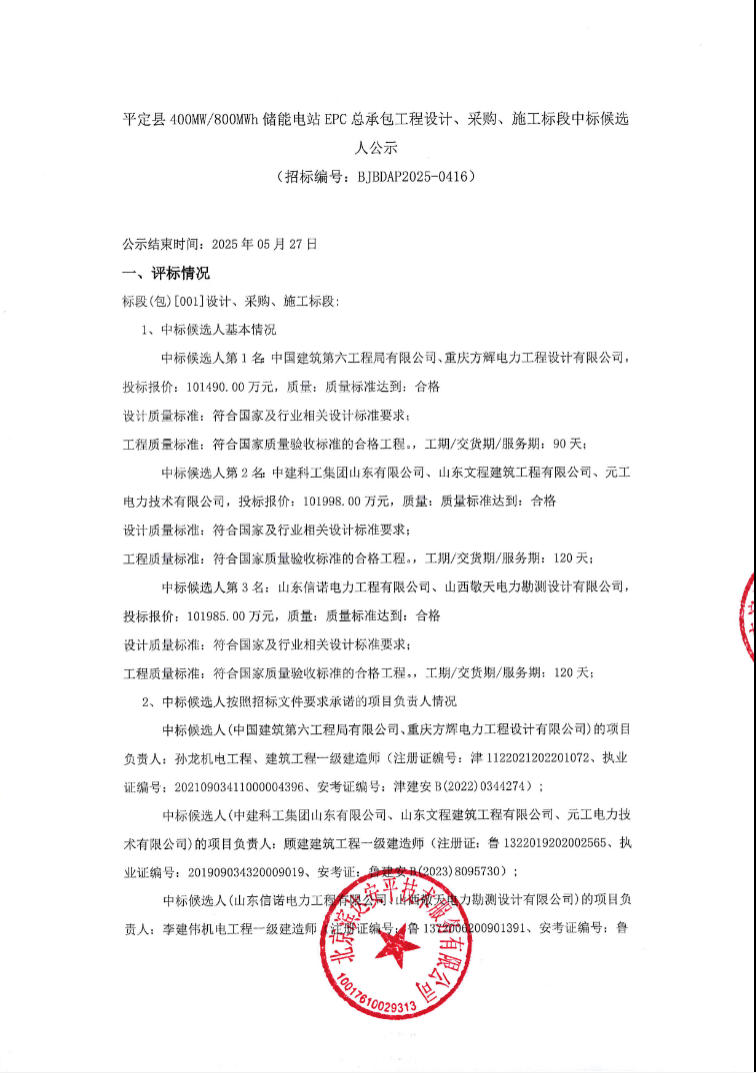 第一中标候选人为中国建筑第六工程局有限公司、重庆方辉电力工程设计有限公司,投标报价为101490万元,折合单价1.269元/Wh;第二中标候选人为中建科工集团山东有限公司、山东文程建筑工程有限公司,投标报价为101998万元,折合单价1.275元/Wh;第三中标候选人为山东信诺电力工程有限公司、山西敬天电力勘测设计有限公司,投标报价为101985万元,折合单价1.2748元/Wh。