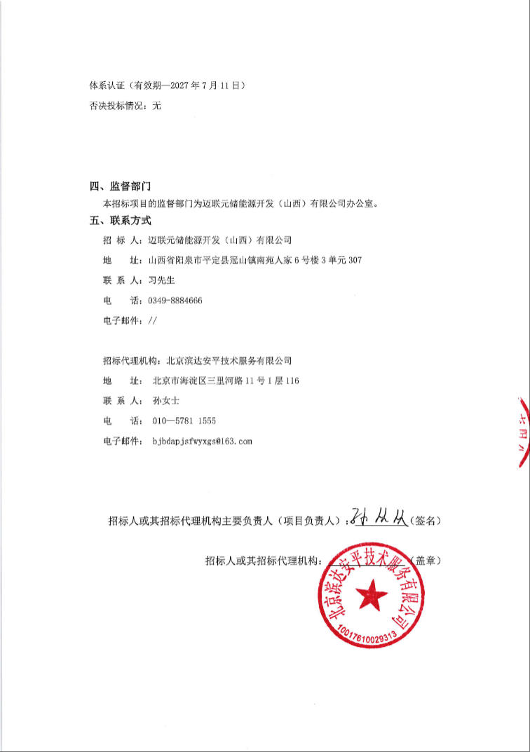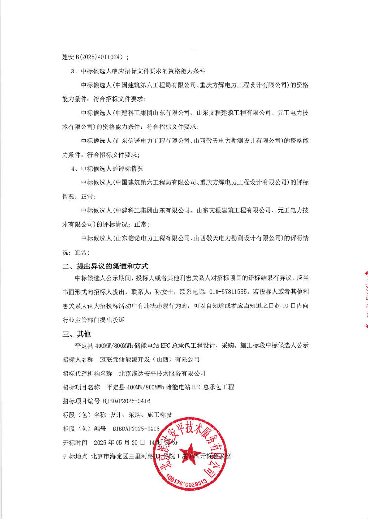 5月22日,平定县400MW/800MWh储能电站EPC总承包工程设计、采购、施工标段中标候选人公示。