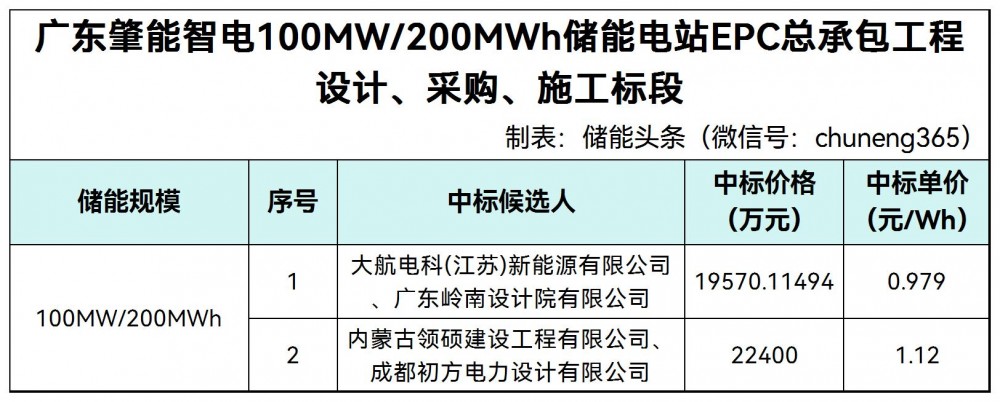 第一中标候选人为大航电科(江苏)新能源有限公司、广东岭南设计院有限公司,投标报价为19570.11494万元,折合单价0.979元/Wh;第二中标候选人为内蒙古领硕建设工程有限公司、成都初方电力设计有限公司,投标报价为22400万元,折合单价1.12元/Wh。