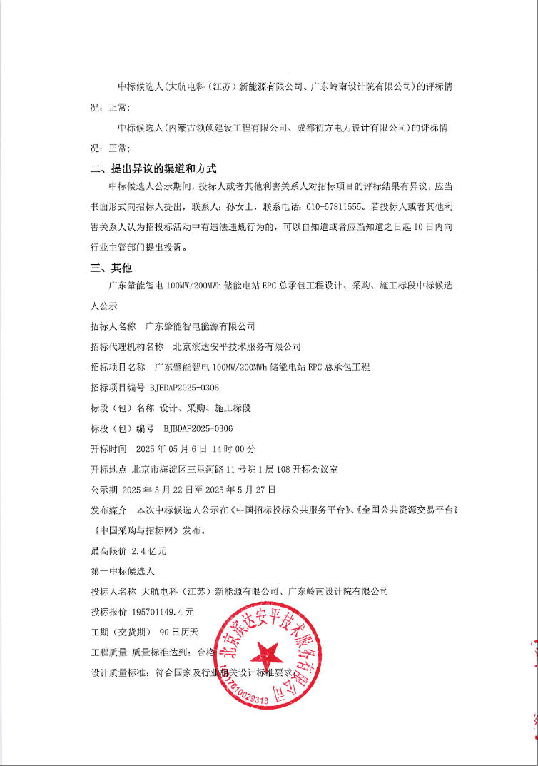 5月22日,广东肇能智电100MW/200MWh储能电站EPC总承包工程设计、采购、施工标段中标候选人公示。
