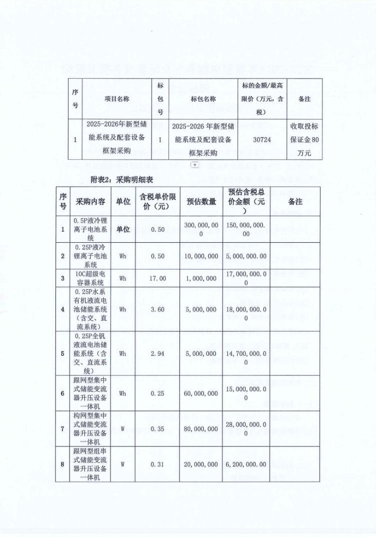 招标采购明细表显示,该项目框采产品包括0.5P锂离子电池系统300MWh(限价0.5元/Wh)、0.25P液冷锂离子电池系统10MWh(限价0.5元/Wh)、10C超级电容系统1MW(限价17元/Wh)、0.25P水系有机液流电池储能系统5MWh(限价3.6元/Wh)、0.25P全钒液流电池储能系统5MWh(限价2.94元/Wh)、跟网型集中式储能变流器升压设备一体机60W(限价0.25元/W)、构网型集中式储能变流器升压设备一体机80W(限价0.35元/W)、跟网型组串式储能变流器升压设备一体机20W(限价0.31元/W)、能量管理系统3套、SVG动态无功补偿装置2套、20MW/40MWh构网型高压级联储能系统。
