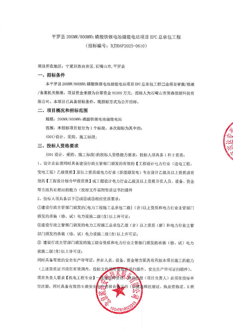 6月11日,宁夏平罗县200MW/800MWh磷酸铁锂电池储能电站EPC招标公告发布。