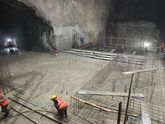 永嘉抽蓄电站位于温州市永嘉县境内,电站总装机容量1200兆瓦,安装4台300兆瓦立轴单级混流可逆式水泵水轮发电机组,设计年发电量12亿千瓦时,设计年抽水用电量16亿千瓦时,综合效率约为75%。地下厂房作为电站的核心枢纽,承担着机组安装、运行控制等重要功能。首仓混凝土的成功浇筑,不仅检验了前期施工方案的科学性与可行性,也验证了项目部应对复杂施工条件的技术能力和管理水平,为后续大规模混凝土施工积累了宝贵经验。