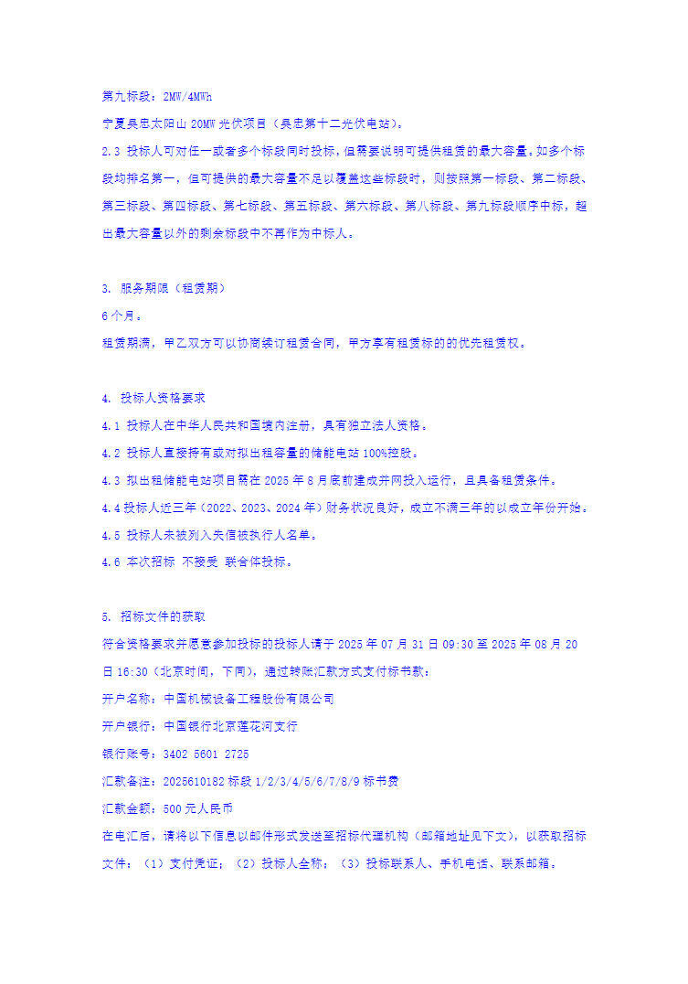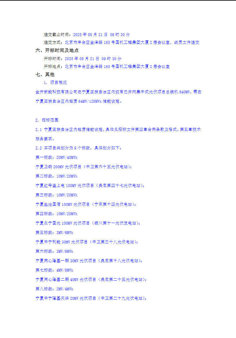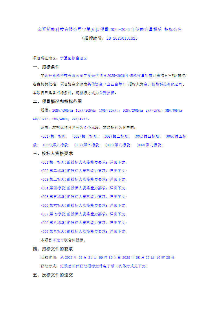 7月31日,金开新能科技有限公司宁夏光伏项目2025-2026年储能容量租赁招标,金开新能科技有限公司在宁夏回族自治区内现有己并网集中式光伏项目总装机640MW,需在宁夏回族自治区内租赁64MW/128MWh储能设施。