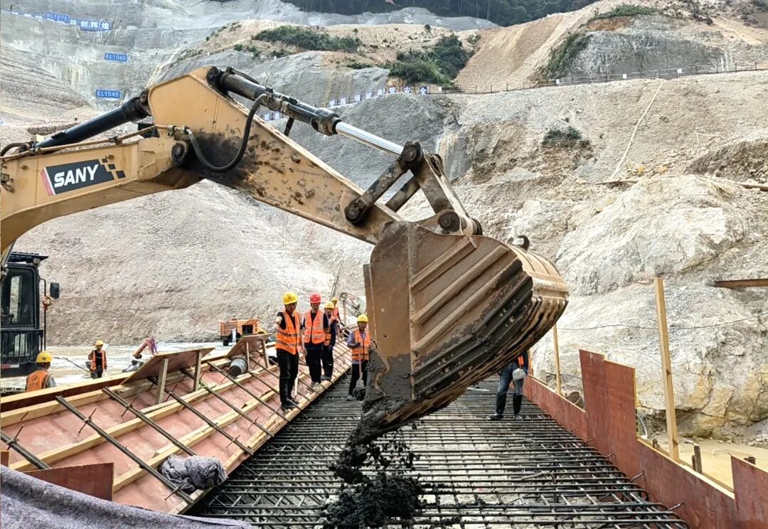 贵州黔南抽水蓄能电站是贵州省“十四五”重点能源项目,总装机容量1500兆瓦,被誉为贵州电网的“超级充电宝”,电站建成后,将在保障电网安全、促进新能源消纳方面发挥关键作用,为贵州省实现“双碳”目标,推动经济社会高质量发展增添强劲的绿色动能。公司主要承建其下水库进/出水口、下水库大坝、下水库溢洪道、下水库导流泄放洞等关键工程。本次浇筑的趾板位于大坝上游区域,总浇筑方量达110立方米。项目团队精心采用“分层浇筑、斜面推进”工艺,确保了浇筑强度、外观质量等各项指标均满足设计要求,为后续施工奠定基础。