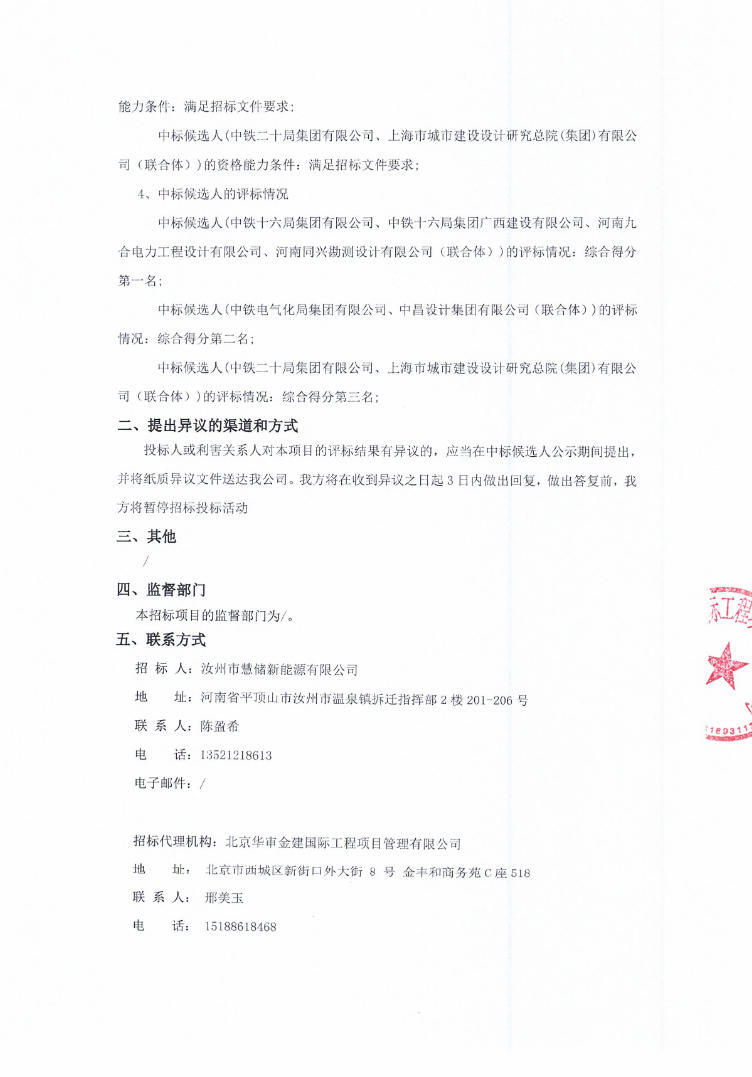 第一中标候选人为中铁十六局集团有限公司、中铁十六局集团广西建设有限公司、河南九合电力工程设计有限公司、河南同兴勘测设计有限公司(联合体),投标报价40999.946万元,折合单价1.024999元/Wh;第二中标候选人为中铁电气化局集团有限公司、中昌设计集团有限公司(联合体),投标报价40999.98万元,折合单价1.0249995元/Wh;第三中标候选人为中铁二十局集团有限公司、上海市城市建设设计研究总院(集团)有限公司(联合体),投标报价40999.984万元,折合单价1.0249996元/Wh。