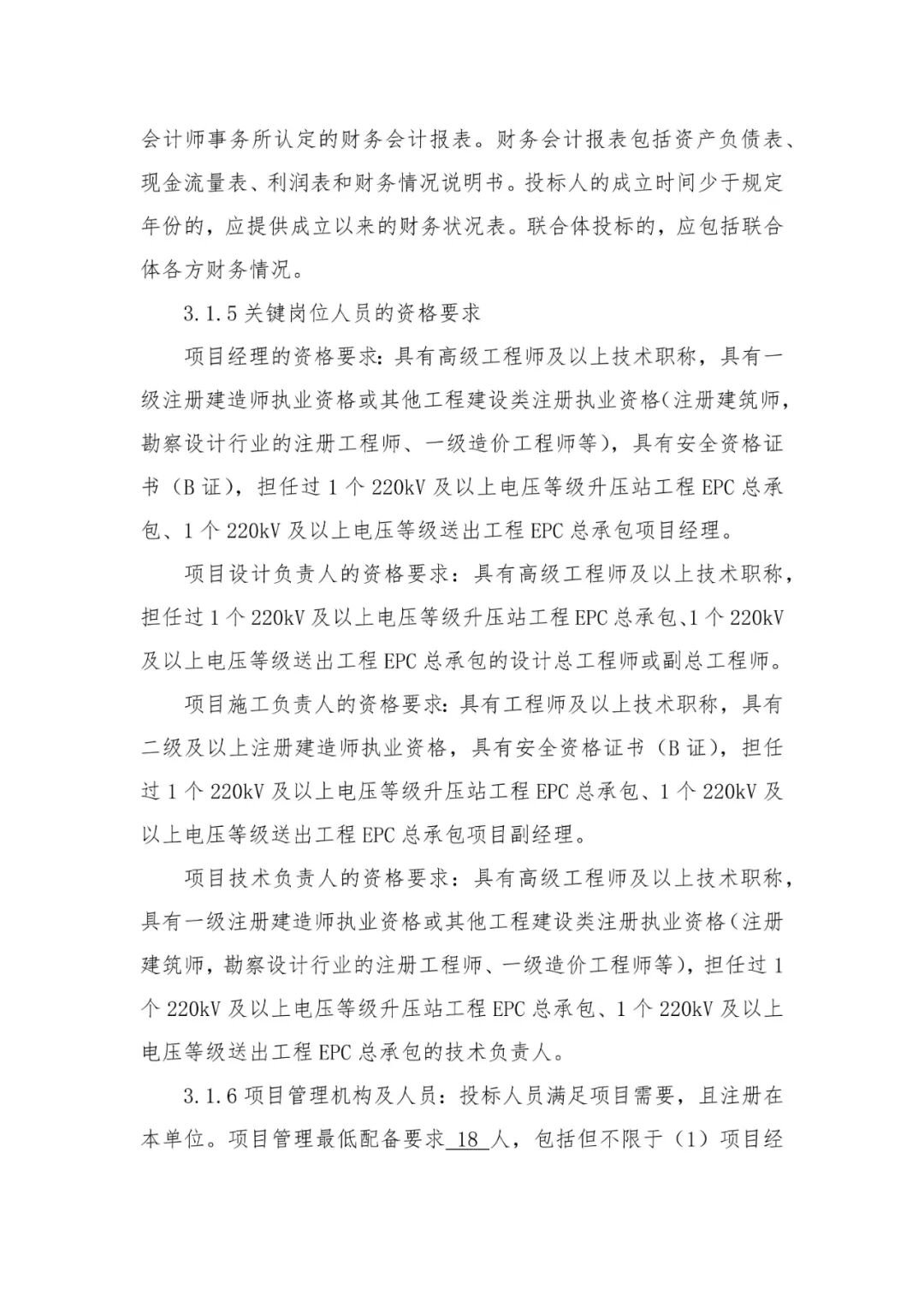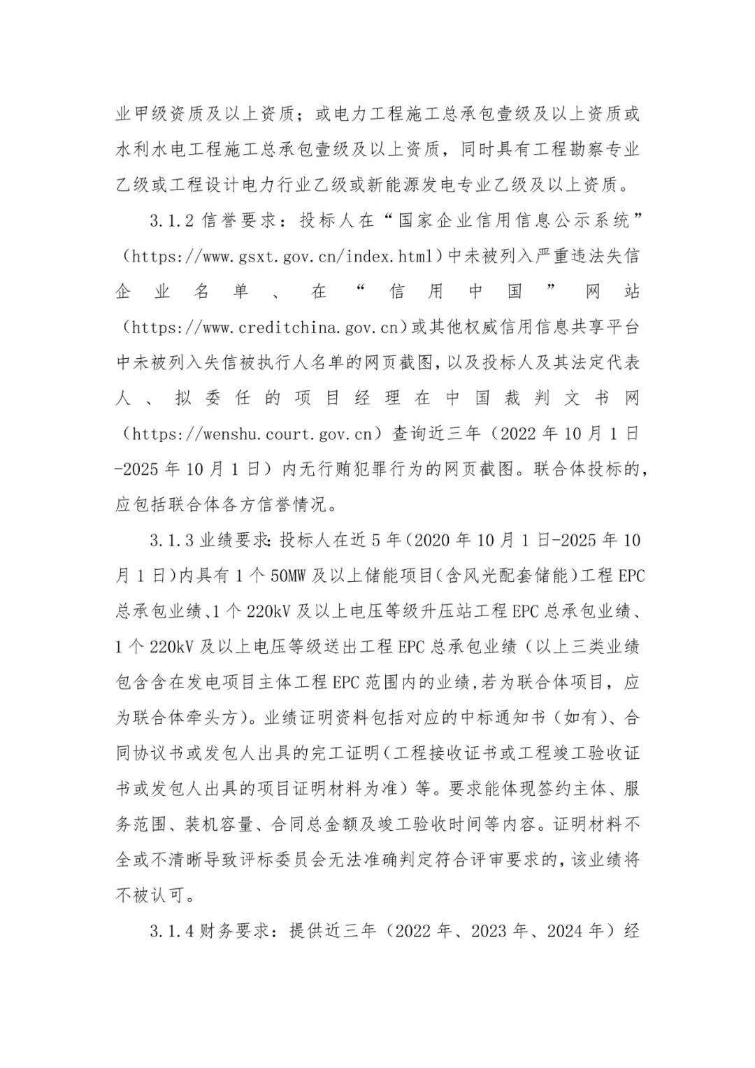 投标人在近5年(2020年10月1日-2025年10月1日)内具有1个50MW及以上储能项目(含风光配套储能)工程EPC总承包业绩、1个220kV及以上电压等级升压站工程EPC总承包业绩、1个220kV及以上电压等级送出工程EPC总承包业绩(以上三类业绩包含含在发电项目主体工程EPC范围内的业绩,若为联合体项目,应为联合体牵头方)。
