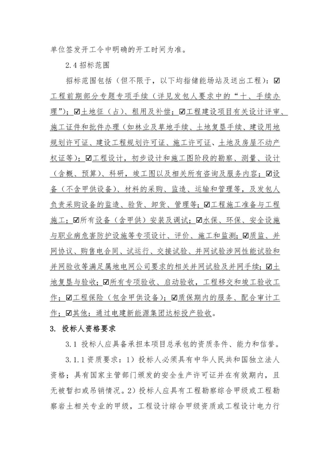 招标范围包括(但不限于,以下均指储能场站及送出工程):工程前期部分专题专项手续(详见发包人要求中的“十、手续办理”);土地征(占)、租用及补偿;工程建设项目有关设计评审、施工证件和批件办理(如林业及草地手续、土地复垦手续、建设用地规划许可证、建设工程规划许可证、施工许可证、土地及房屋不动产权证等);工程设计,初步设计和施工图阶段的勘察、测量、设计(含概、预算)、科研,竣工图以及相关所有咨询及服务内容;设备(不含甲供设备)、材料的采购、监造、运输和管理等,及发包人负责采购设备的监造、验货、卸货、管理等;工程施工准备与工程施工;所有设备(含甲供)安装及调试;水保、环保、安全设施与职业病危害防护设施等专项设计、评价、施工和监测;质监、并网协议、购售电合同、试运行、交接试验、并网试验涉网性能试验和并网验收等满足属地电网公司要求的相关并网试验及并网手续;土地复垦与验收;所有专项验收、启动验收,工程移交和竣工验收工作;工程保险(包含甲供设备);质保期内的服务、配合审计工作;其他:通过电建新能源集团达标投产验收。