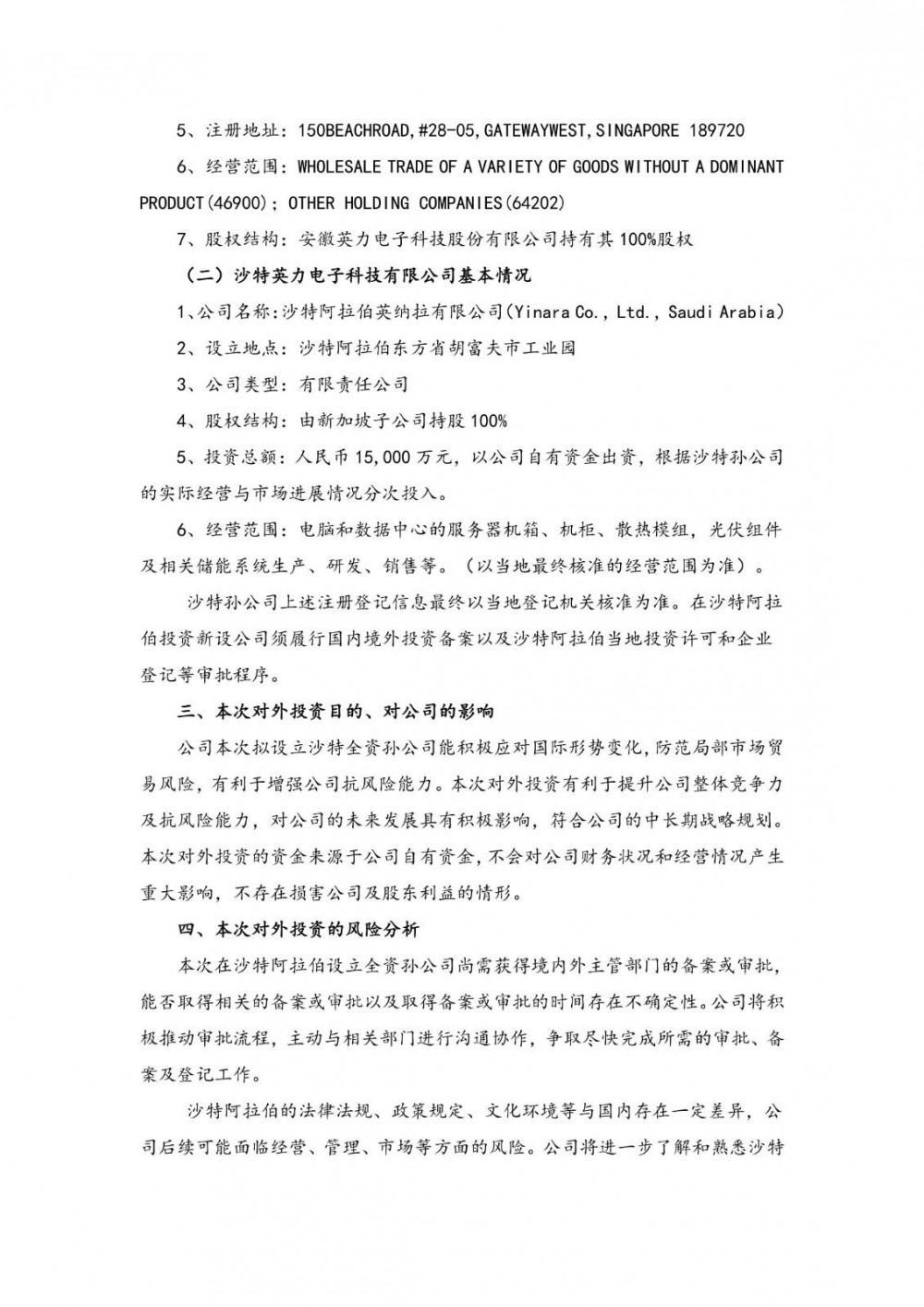10月23日,英力股份发布公告称,根据公司战略发展及业务拓展需求,为加快国际化发展战略布局,进一步提高公司综合竞争实力,为公司海外业务的开展提供有效通道,公司拟以自有资金向全资子公司YINARA GROUP PTE.LTD(以下简称“新加坡子公司”)增资人民币15,000万元。本次增资的款项将用于新加坡子公司投资设立沙特阿拉伯英纳拉有限公司(暂定名,具体以沙特阿拉伯相关主管机关核准登记为准,以下简称“沙特孙公司”),用于投资建设围绕公司主营业务开展的海外产能建设项目。同时,授权公司管理层依据法律、法规的规定办理沙特孙公司的工商注册登记等相关工作并签署相关协议。