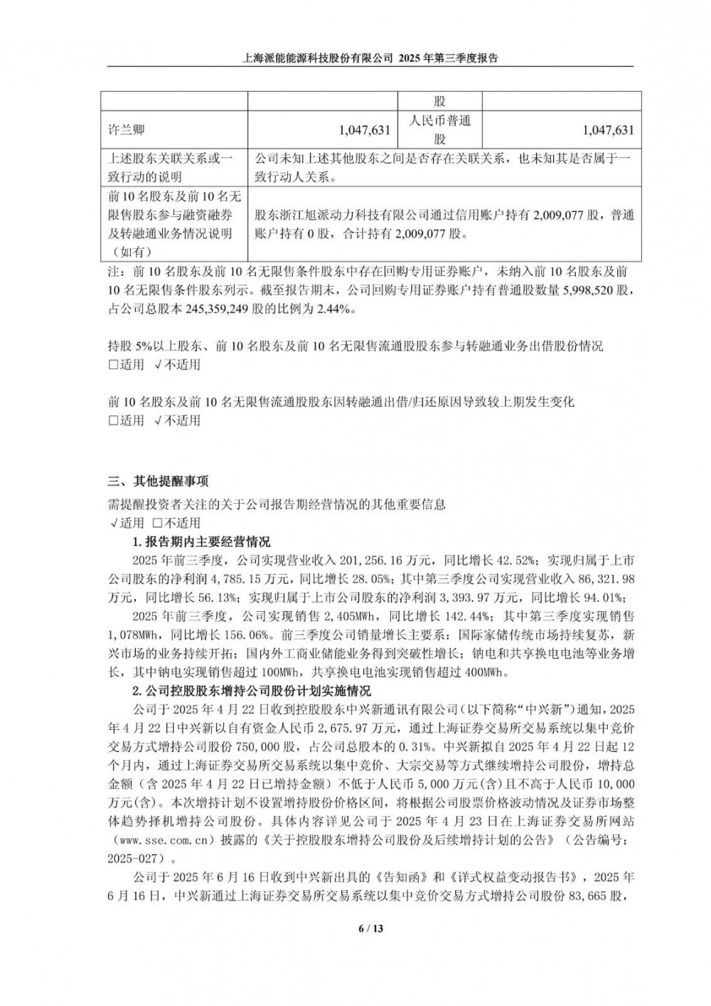 2025年前三季度,派能科技实现销售2,405MWh,同比增长142.44%;其中第三季度实现销售1,078MWh,同比增长156.06%。