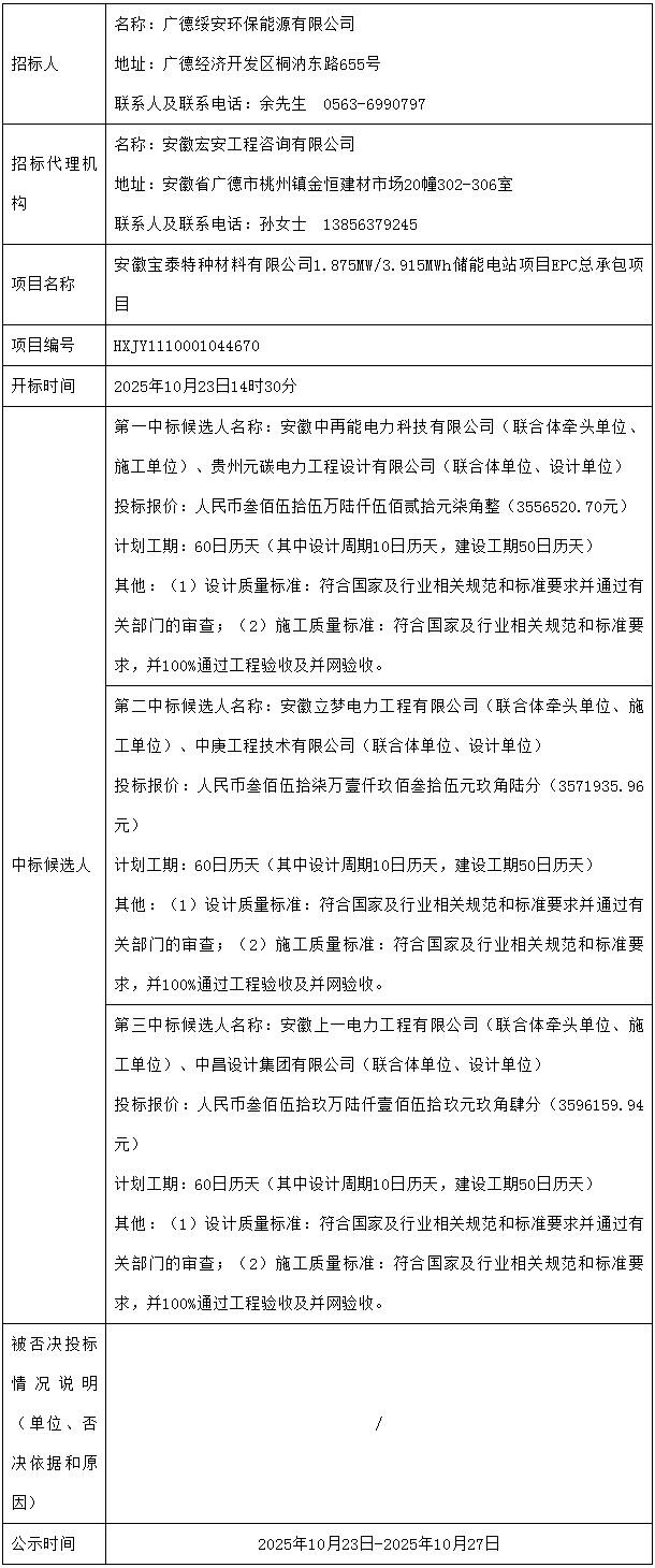 安徽宝泰特种材料有限公司1.875MW/3.915MWh储能电站项目EPC总承包项目中标候选人公示