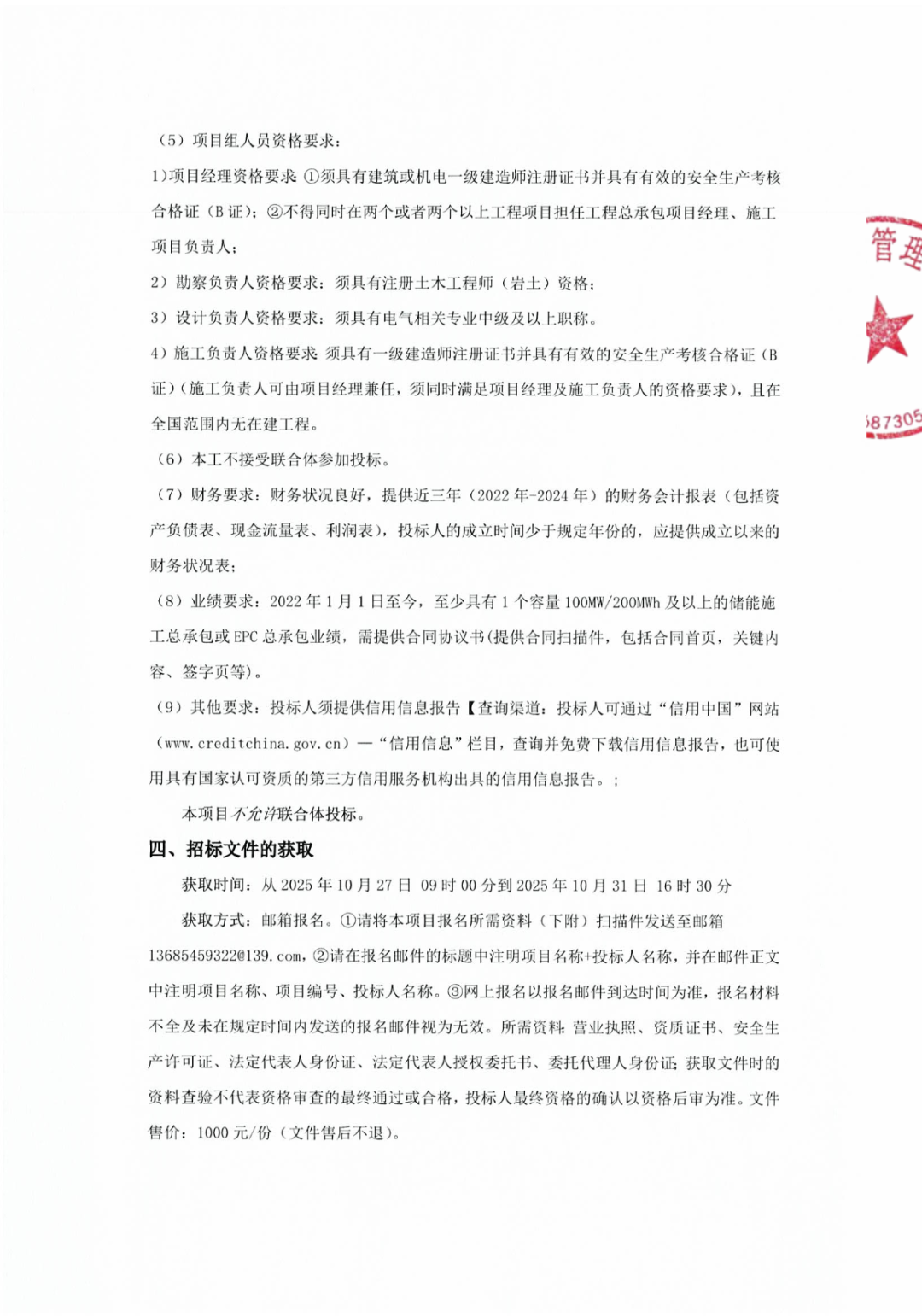 投标人业绩要求:2022年1月1日至今,至少具有1个容量100MW/200MWh及以上的储能施工总承包或EPC总承包业绩。