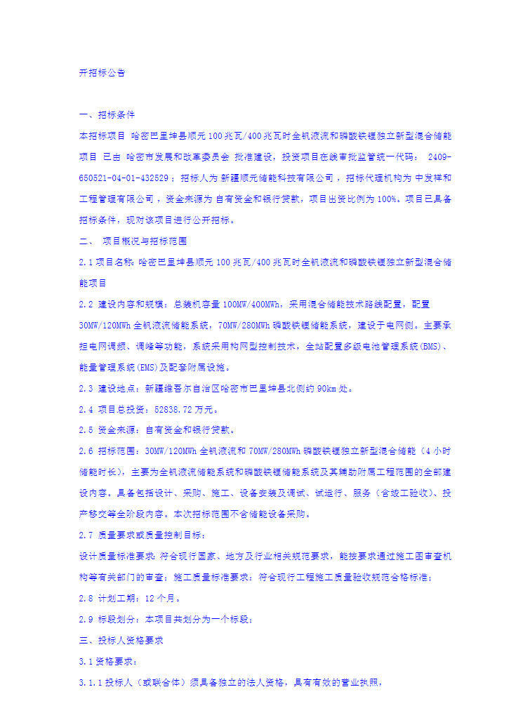 10月27日,哈密巴里坤县顺元100兆瓦/400兆瓦时全钒液流和磷酸铁锂独立新型混合储能项目公开招标公告发布。