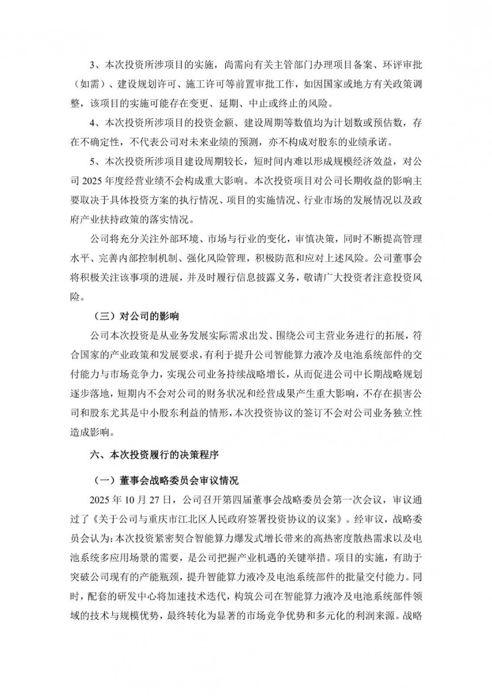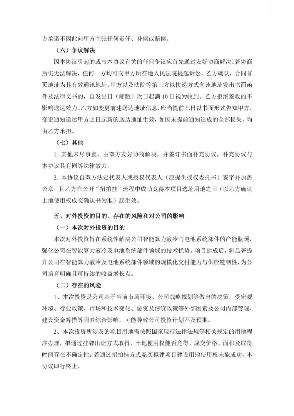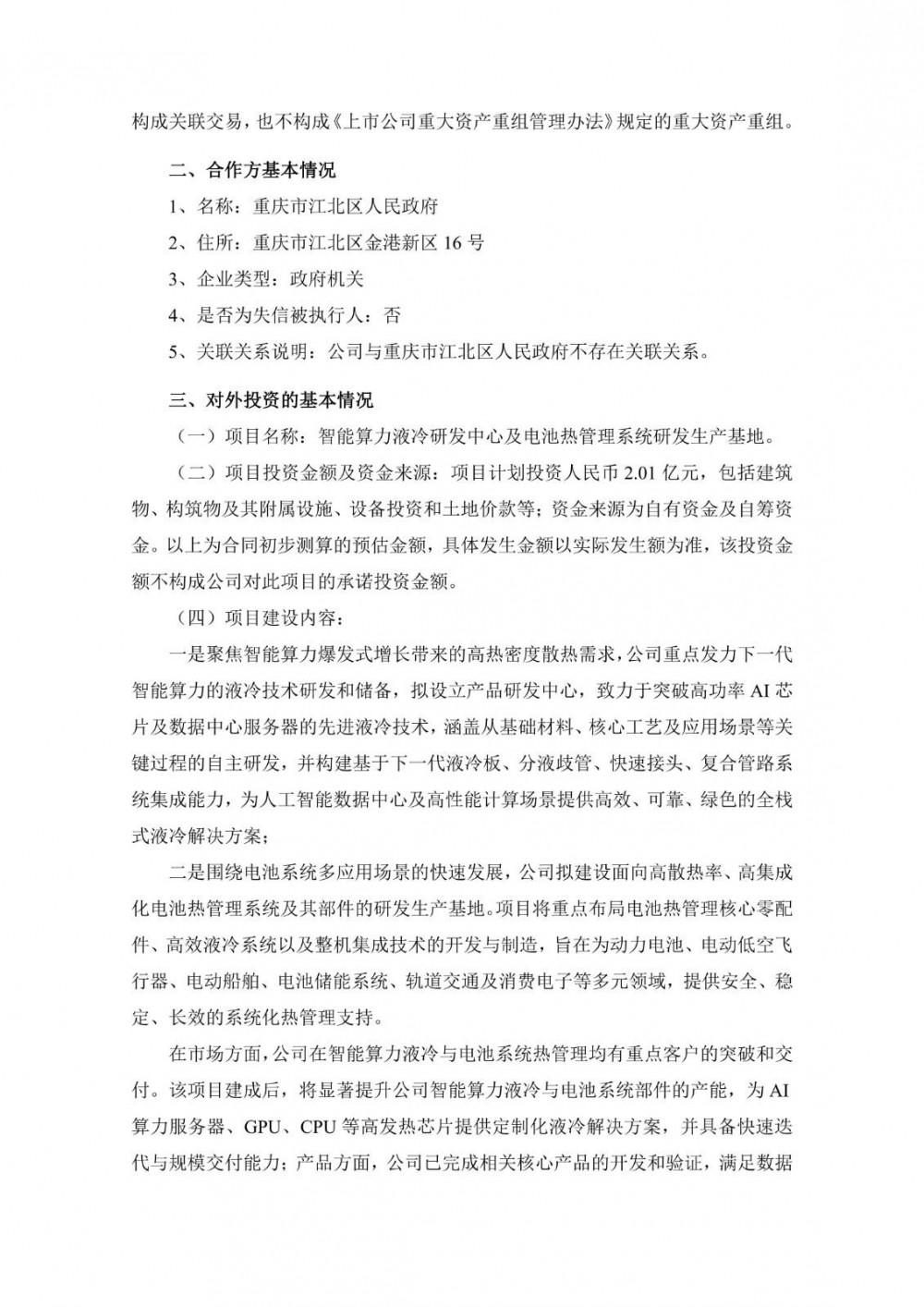 二是围绕电池系统多应用场景的快速发展,公司拟建设面向高散热率、高集成化电池热管理系统及其部件的研发生产基地。项目将重点布局电池热管理核心零配件、高效液冷系统以及整机集成技术的开发与制造,旨在为动力电池、电动低空飞行器、电动船舶、电池储能系统、轨道交通及消费电子等多元领域,提供安全、稳定、长效的系统化热管理支持。