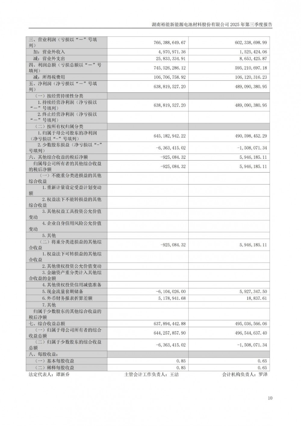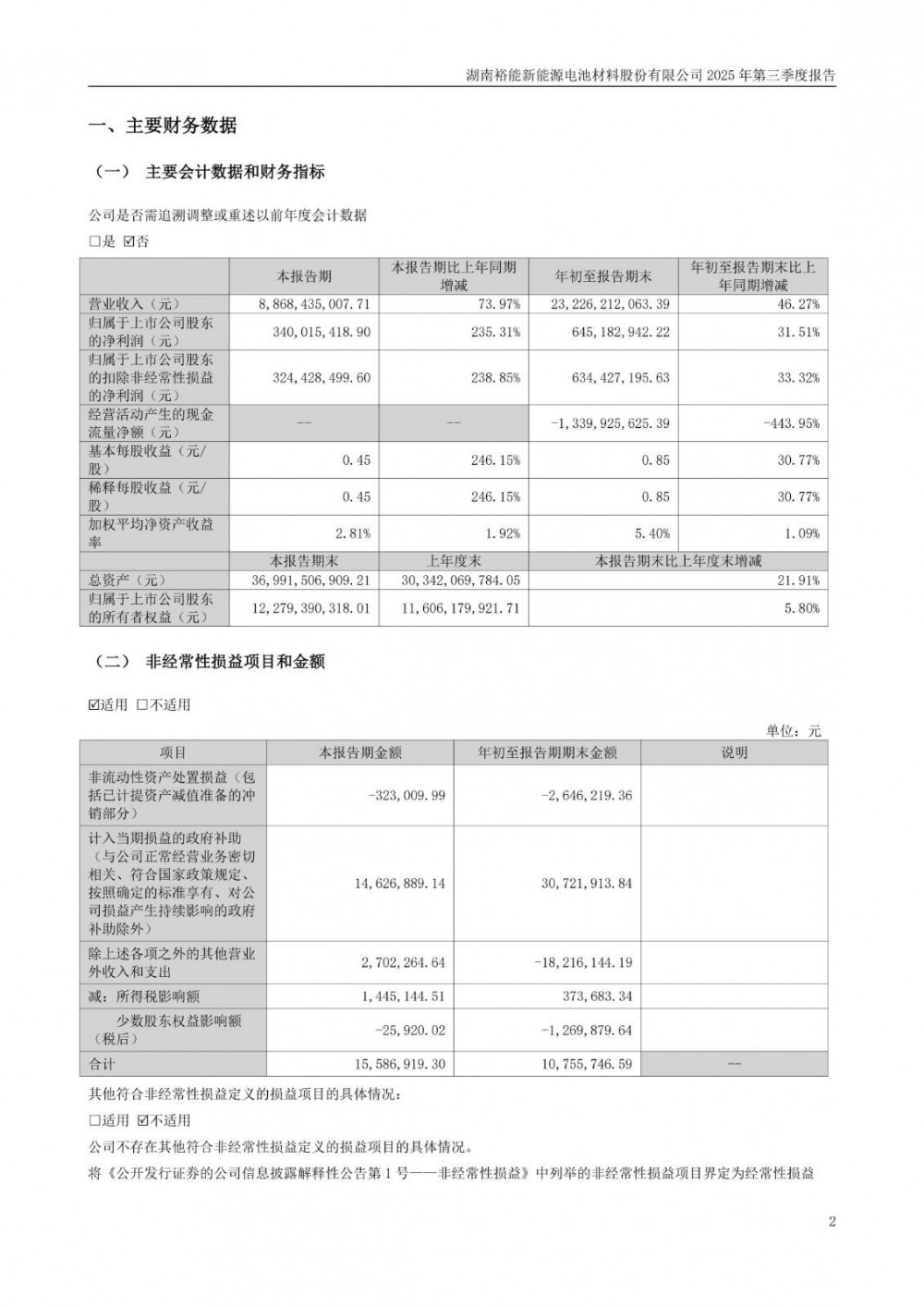 10月27日,湖南裕能发布2025年第三季度报告。前三季度公司实现营业总收入232.26亿元,同比增长46.27%;归母净利润6.45亿元,同比增长31.51%。