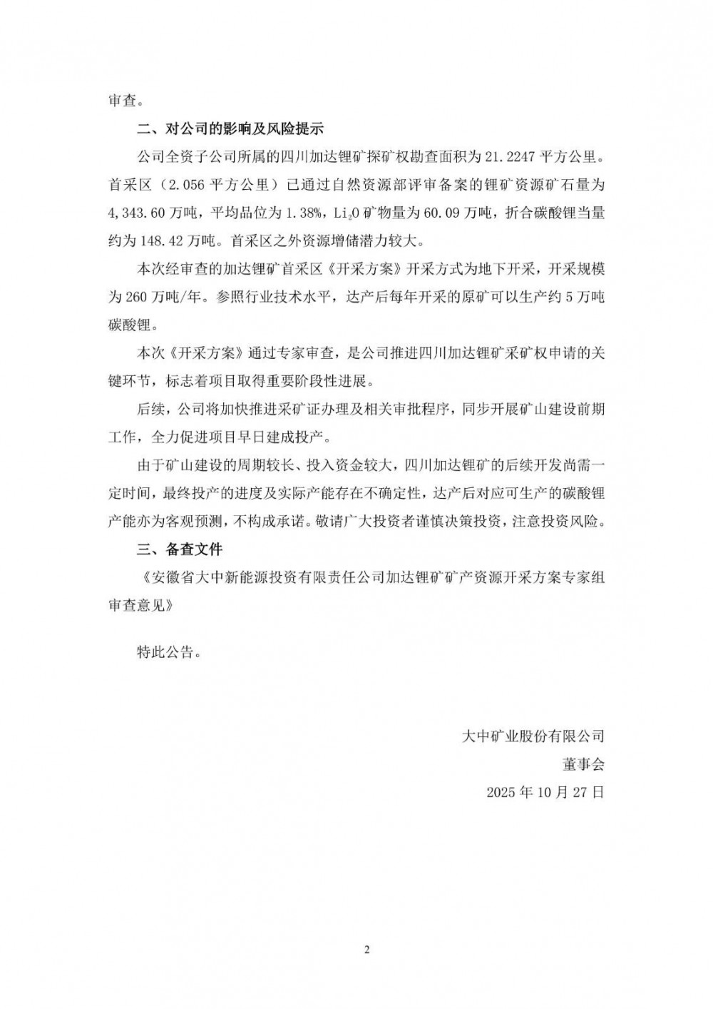 大中矿业表示,由于矿山建设的周期较长、投入资金较大,四川加达锂矿的后续开发尚需一定时间,最终投产的进度及实际产能存在不确定性,达产后对应可生产的碳酸锂产能亦为客观预测,不构成承诺。