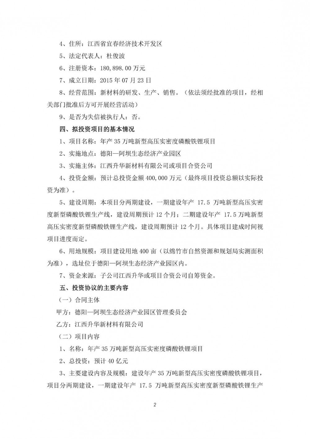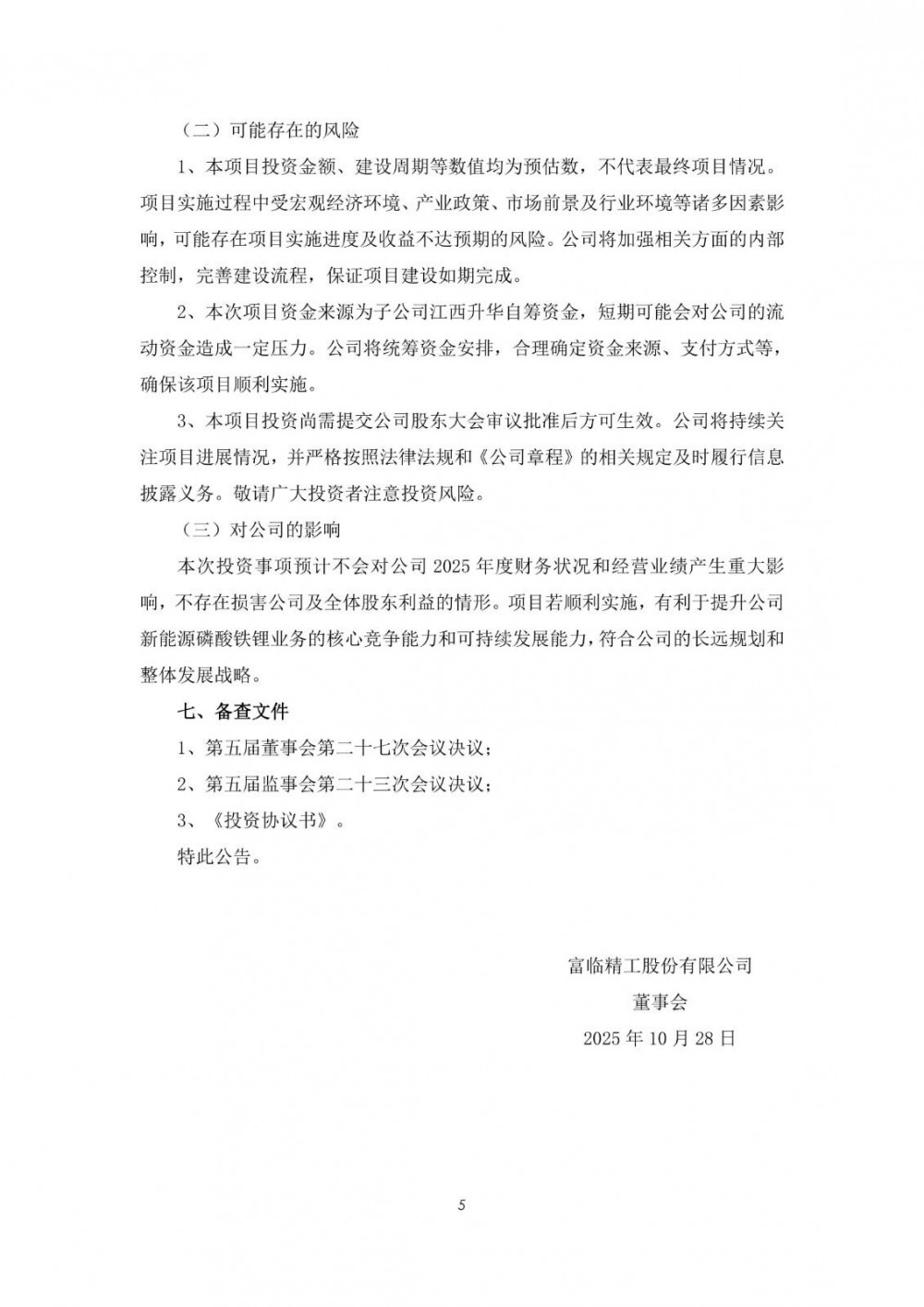 10月28日,富临精工发布公告称,公司召开第五届董事会第二十七次会议、第五届监事会第二十三次会议,审议通过了《关于签订<投资协议书>暨新建年产35万吨新型高压实密度磷酸铁锂项目的议案》。经友好协商,公司子公司江西升华新材料有限公司拟与德阳—阿坝生态经济产业园区管理委员会签订《投资协议书》,江西升华拟在德阳—阿坝生态经济产业园区内投资建设年产35万吨新型高压实密度磷酸铁锂项目,预计总投资金额400,000万元。