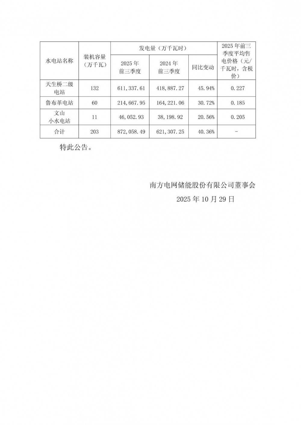 10月28日,南网储能发布2025年前三季度部分经营数据公告。