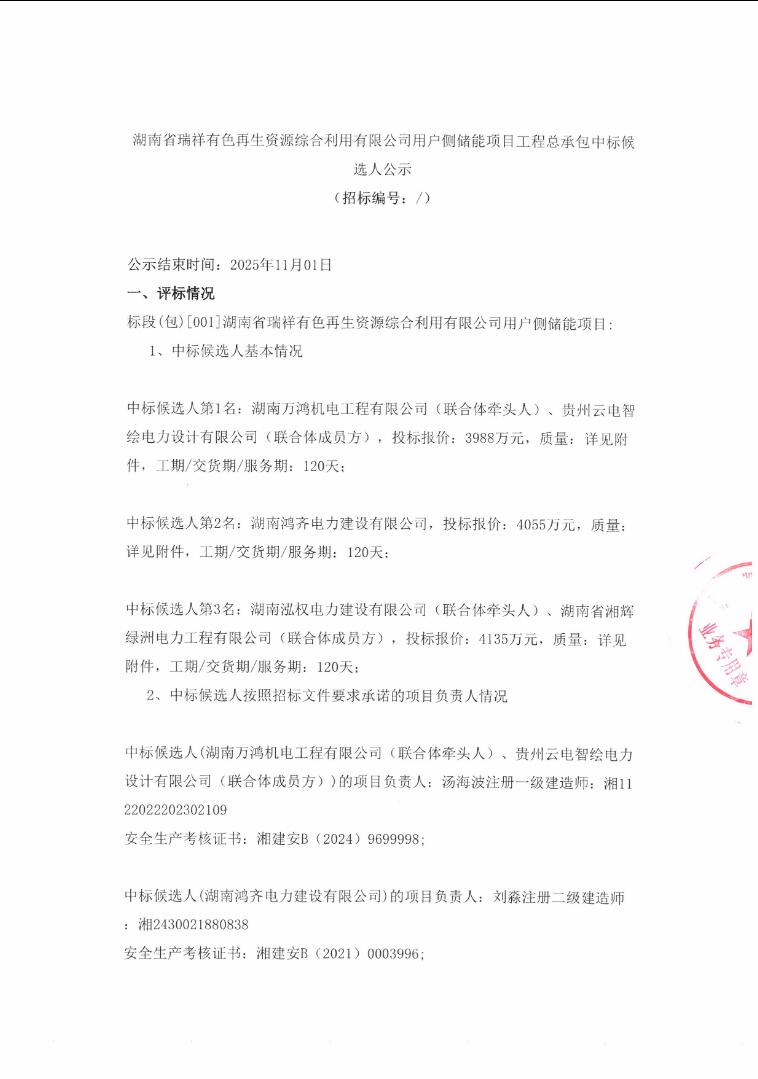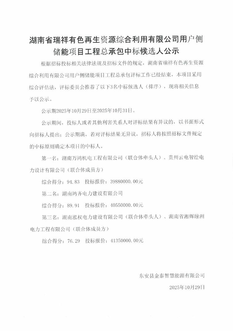 10月29日,湖南省瑞祥有色再生资源综合利用有限公司用户侧储能项目工程总承包中标候选人公示。
