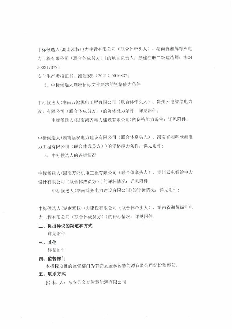 第一中标候选人为湖南万鸿机电工程有限公司(联合体牵头人)、贵州云电智绘电力设计有限公司(联合体成员方),投标报价39880000元,折合单价0.8862元/Wh;第二中标候选人为湖南鸿齐电力建设有限公司,投标报价40550000元,折合单价0.9011元/Wh;第三中标候选人为湖南泓权电力建设有限公司(联合体牵头人)、湖南省湘辉绿洲电力工程有限公司(联合体成员方),投标报价41350000元,折合单价0.9189元/Wh。