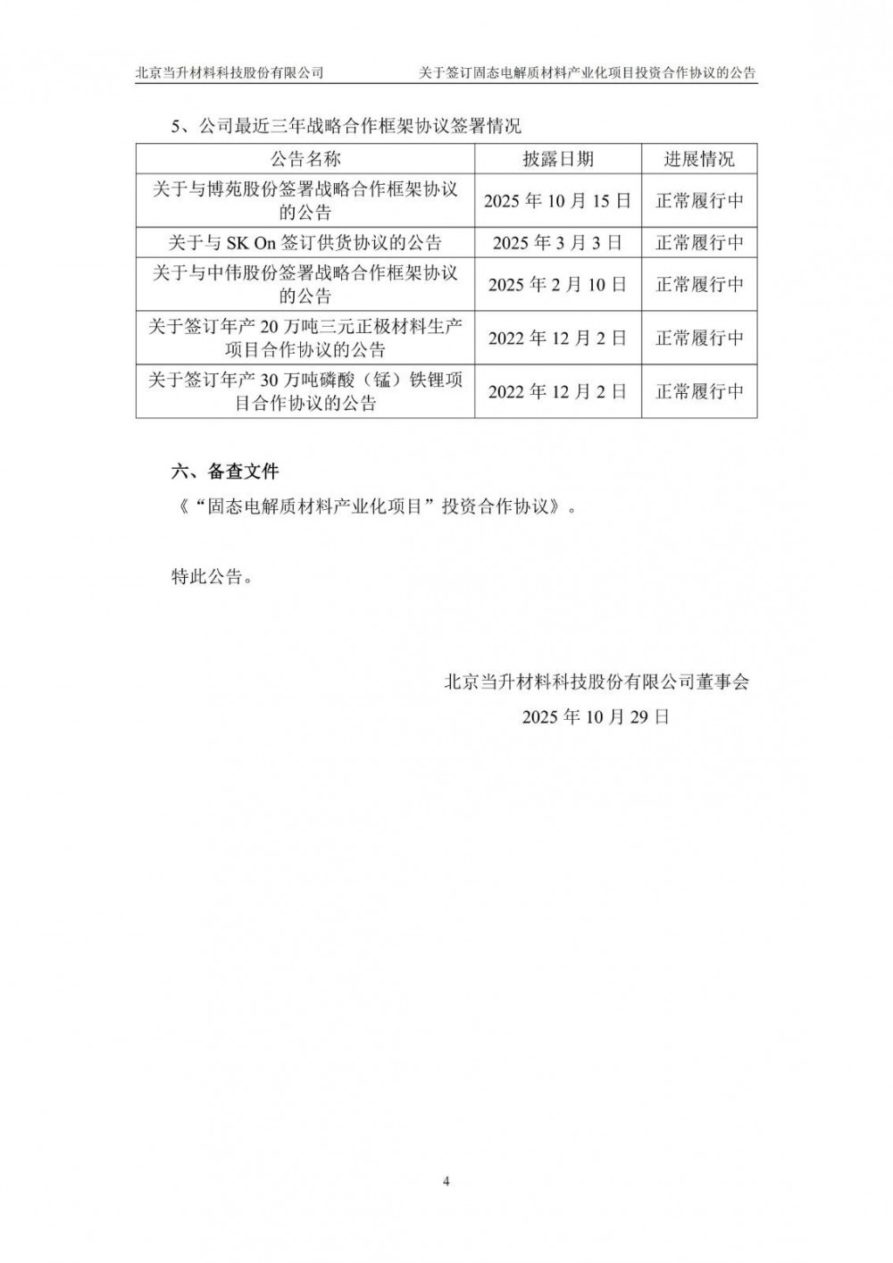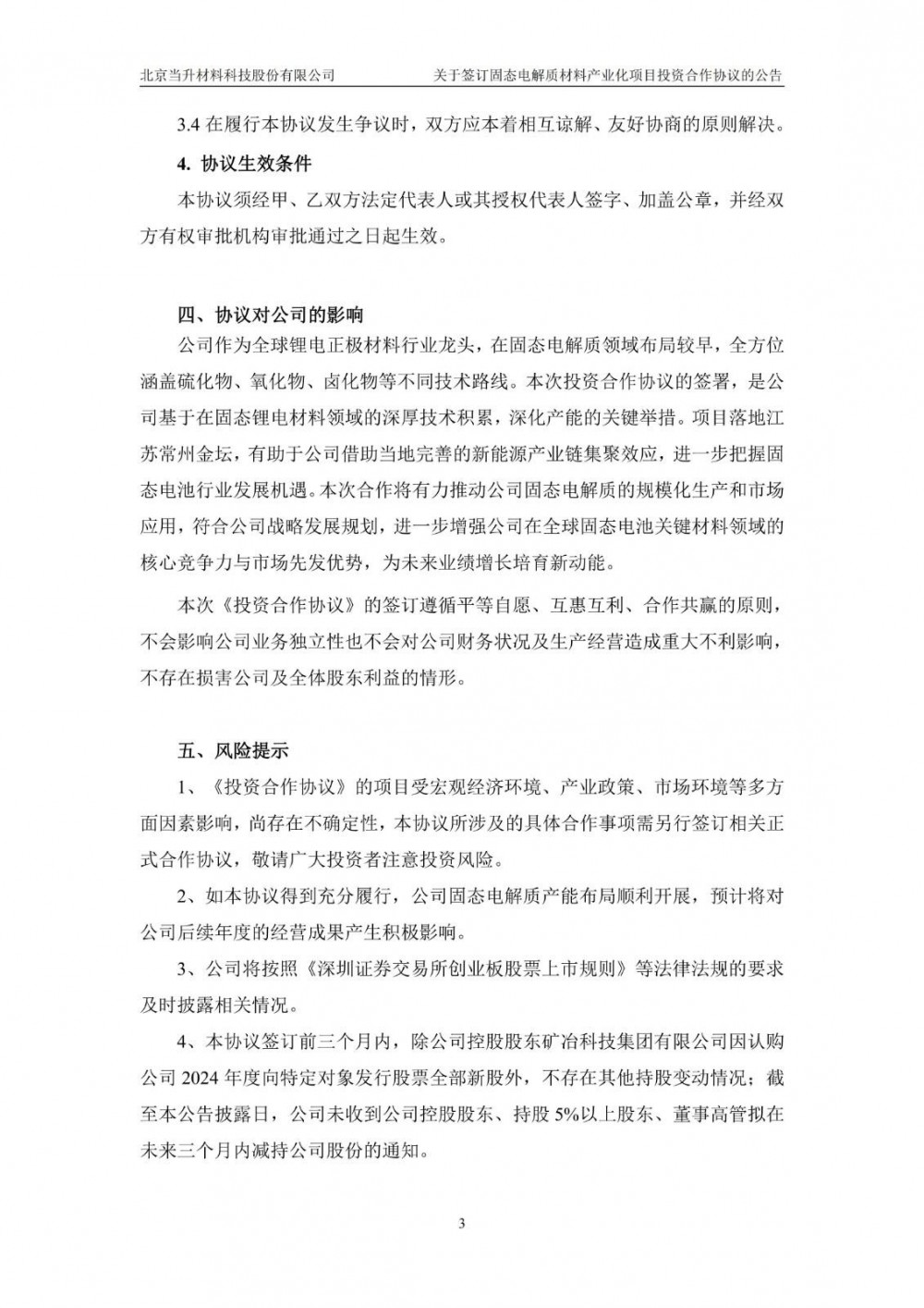 10月29日,当升科技发布公告称,为加快全固态电解质产业化进程,完善北京当升材料科技股份有限公司固态锂电材料产能布局,公司与江苏金坛经济开发区管理委员会签署《“固态电解质材料产业化项目”投资合作协议》,项目实施主体是公司全资子公司当升科技(常州)新材料有限公司。