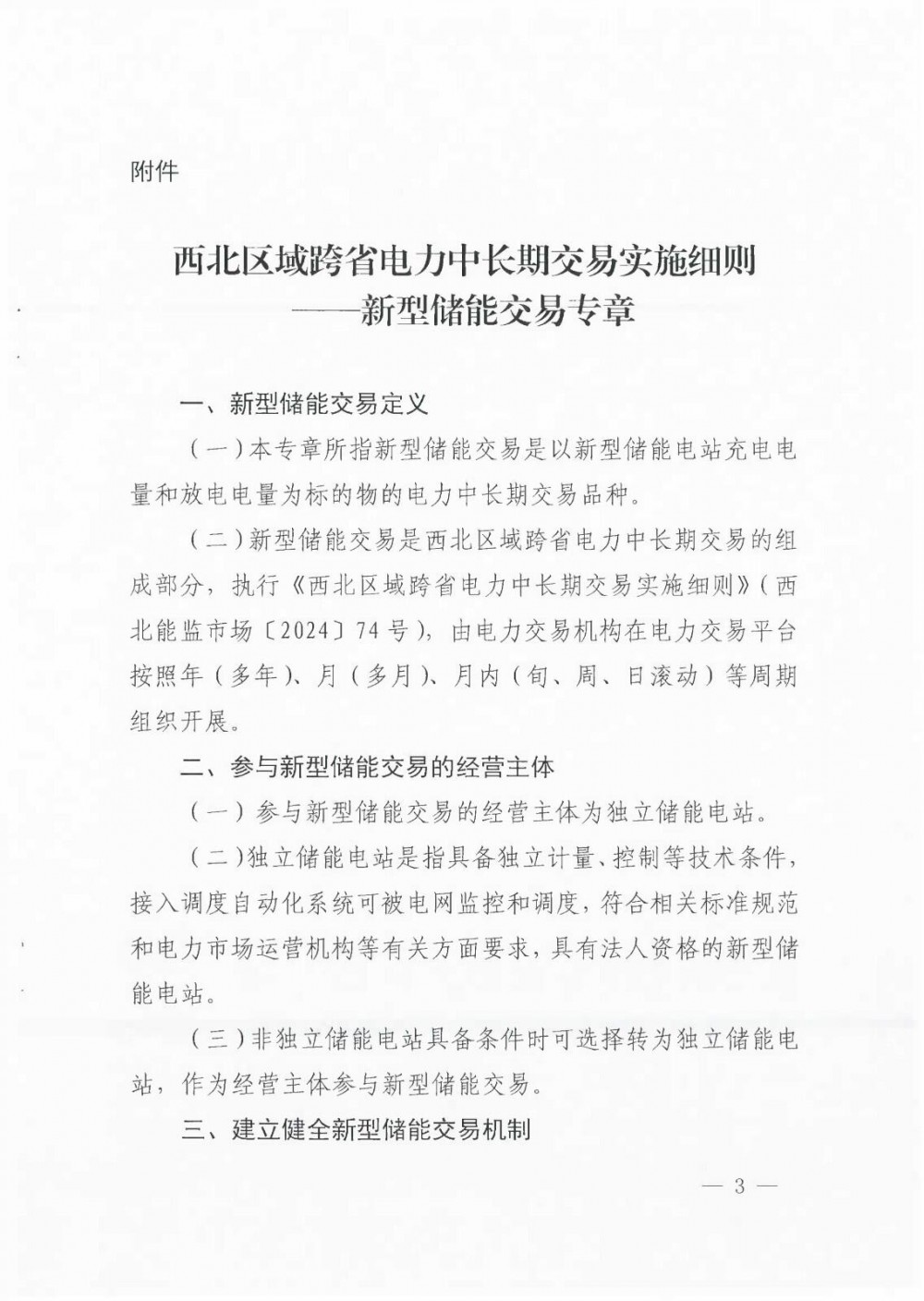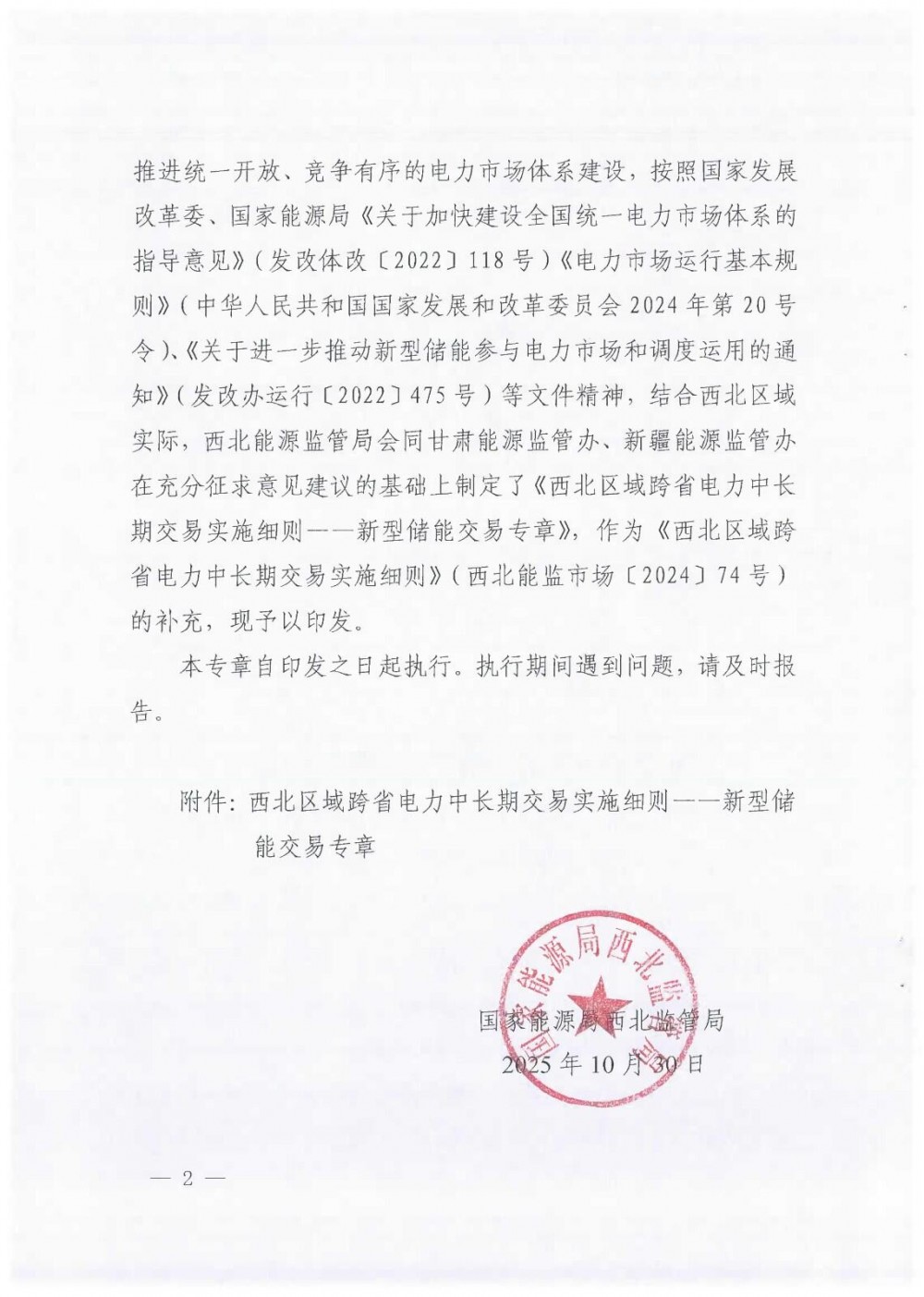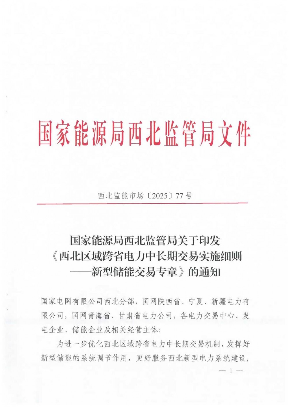 附件:西北监能市场〔2025〕77号 -国家能源局西北监管局关于印发《西北区域跨省电力中长期交易实施细则——新型储能交易专章》的通知.pdf