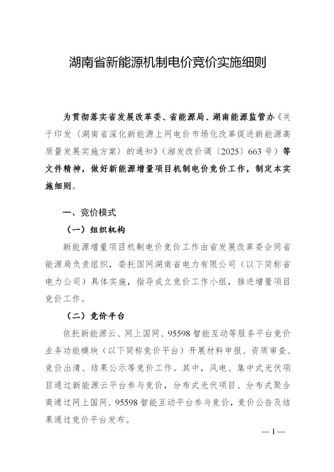 为公平、公正推动新能源增量项目机制电价竞价工作,根据省发展改革委、省能源局、湖南能源监管办《关于印发〈湖南省深化新能源上网电价市场化改革促进新能源高质量发展实施方案〉的通知》(湘发改价调〔2025〕663号)等文件精神,结合我省实际,研究制定《湖南省新能源机制电价竞价实施细则》,现印发给你们,请遵照执行。