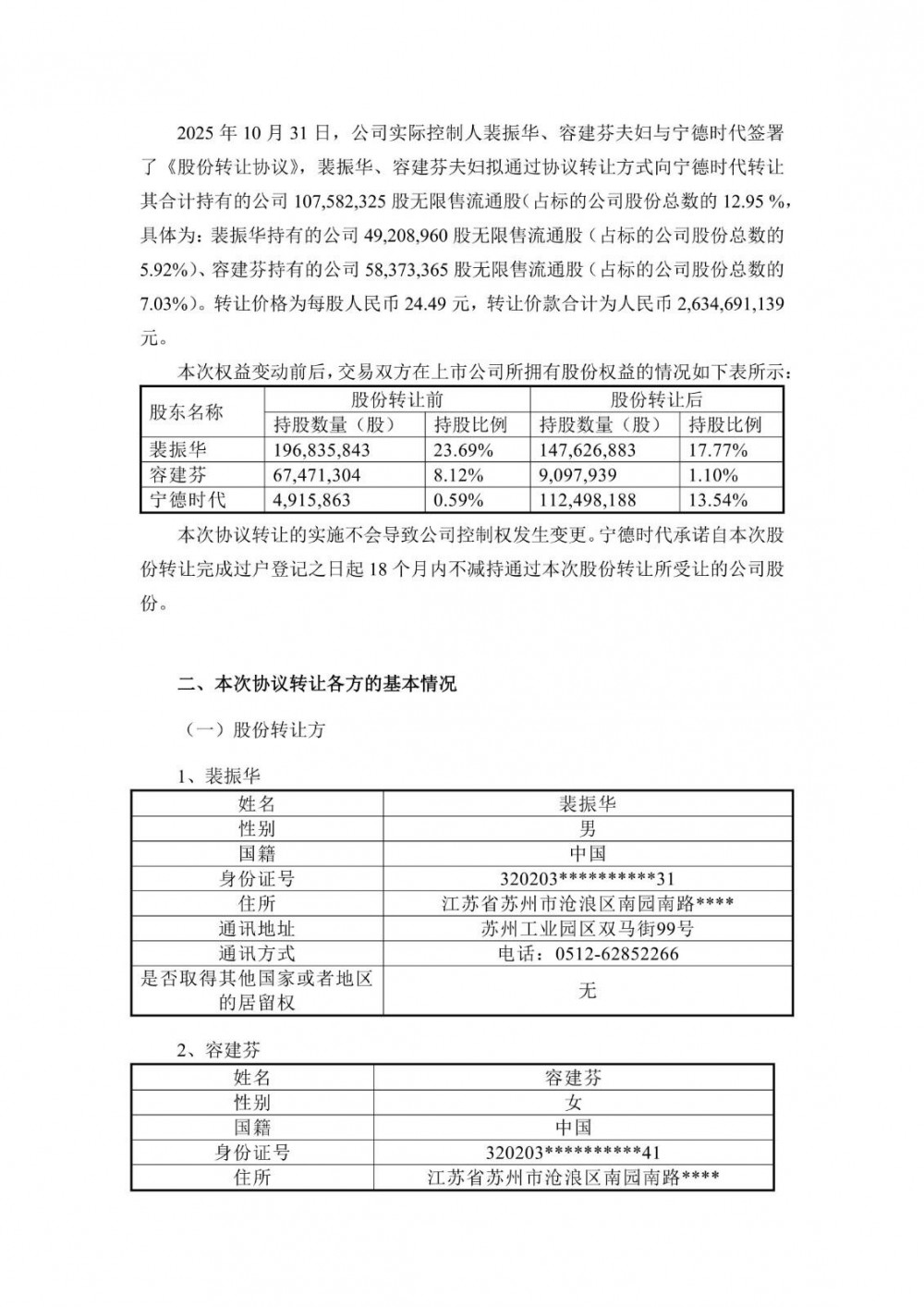 近日,天华新能发布公告称,公司实际控制人裴振华、容建芬夫妇与宁德时代新能源科技股份有限公司(下称“宁德时代”)签署了《关于苏州天华新能源科技股份有限公司之股份转让协议》(下称“《股份转让协议》”)。裴振华、容建芬夫妇拟通过协议转让方式向宁德时代转让其合计持有的公司107,582,325股无限售流通股(占标的公司股份总数的12.95%,具体为:裴振华持有的公司49,208,960股无限售流通股(占标的公司股份总数的5.92%)、容建芬持有的公司58,373,365股无限售流通股(占标的公司股份总数的7.03%)。