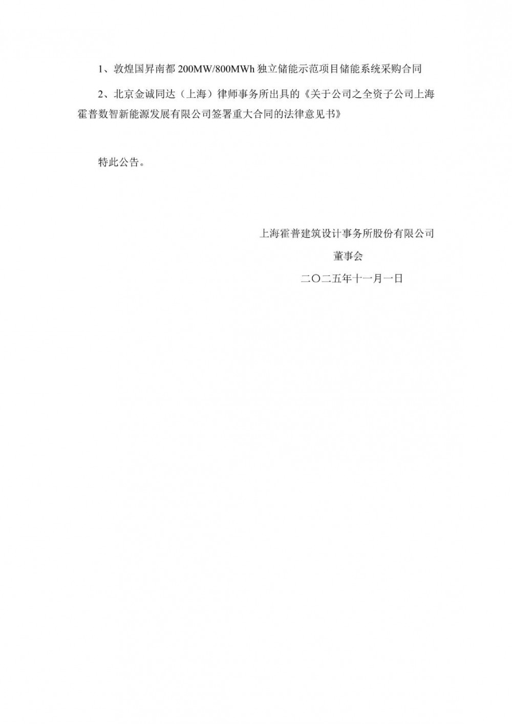 近日,霍普股份发布公告称,上海霍普建筑设计事务所股份有限公司全资子公司上海霍普数智新能源发展有限公司与中国能源建设集团甘肃省电力设计院有限公司(以下简称“甘肃院”)签订《敦煌国昇南都200MW/800MWh独立储能示范项目储能系统采购合同》。