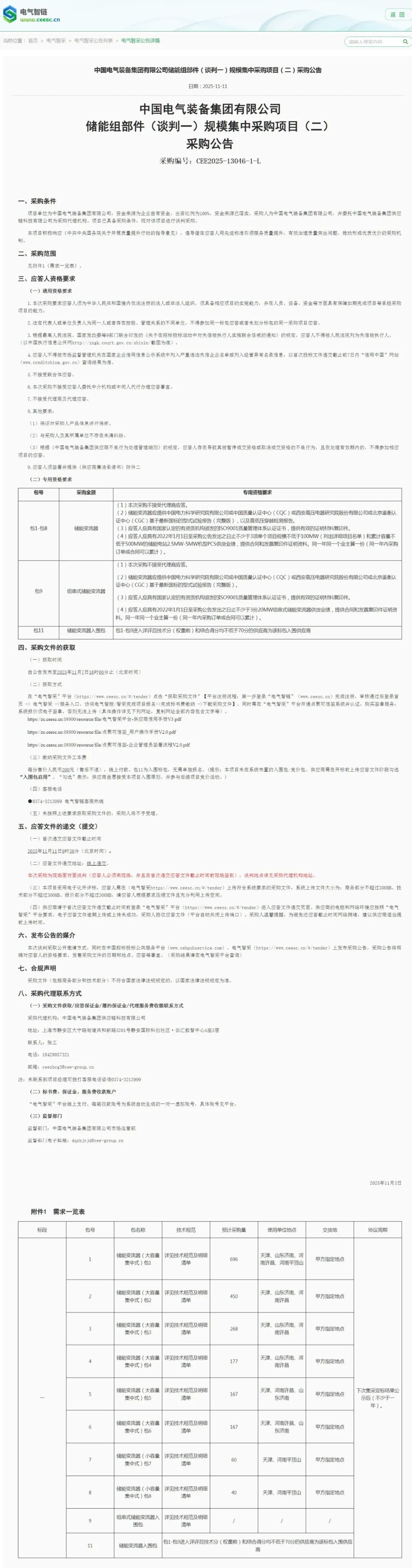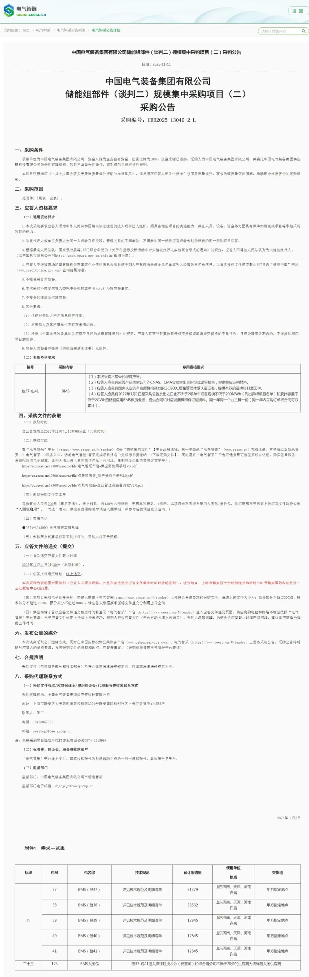 能源圈获悉,11月3日,中国电气装备集团有限公司储能组部件(谈判一、谈判二)规模集中采购项目(二)采购公告发布,集中采购储能变流器、BMS以及相应的入围包,拟采购至少2025套储能变流器和12.8446万套BMS。
