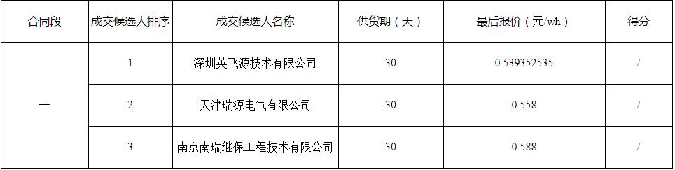 第一中标候选人为深圳英飞源技术有限公司,折合单价0.539352535元/Wh;第二中标候选人为天津瑞源电气有限公司,折合单价0.558元/Wh;第三中标候选人为南京南瑞继保工程技术有限公司,折合单价0.588元/Wh。
