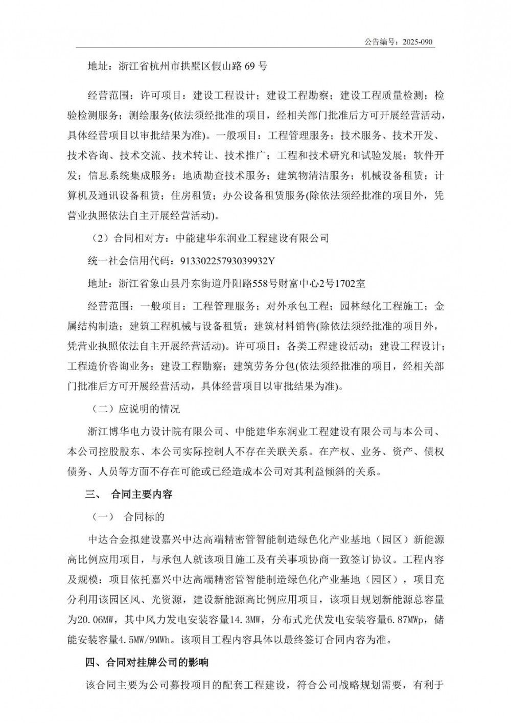 公告显示,中达合金拟建设嘉兴中达高端精密管智能制造绿色化产业基地(园区)新能源高比例应用项目,与承包人就该项目施工及有关事项协商一致签订协议。工程内容及规模:项目依托嘉兴中达高端精密管智能制造绿色化产业基地(园区),项目充分利用该园区风、光资源,建设新能源高比例应用项目,该项目规划新能源总容量为20.06MW,其中风力发电安装容量14.3MW,分布式光伏发电安装容量6.87MWp,储能安装容量4.5MW/9MWh。该项目工程内容具体以最终签订合同内容为准。