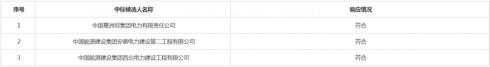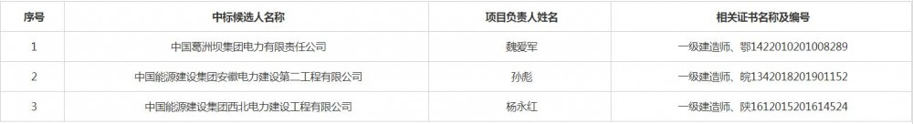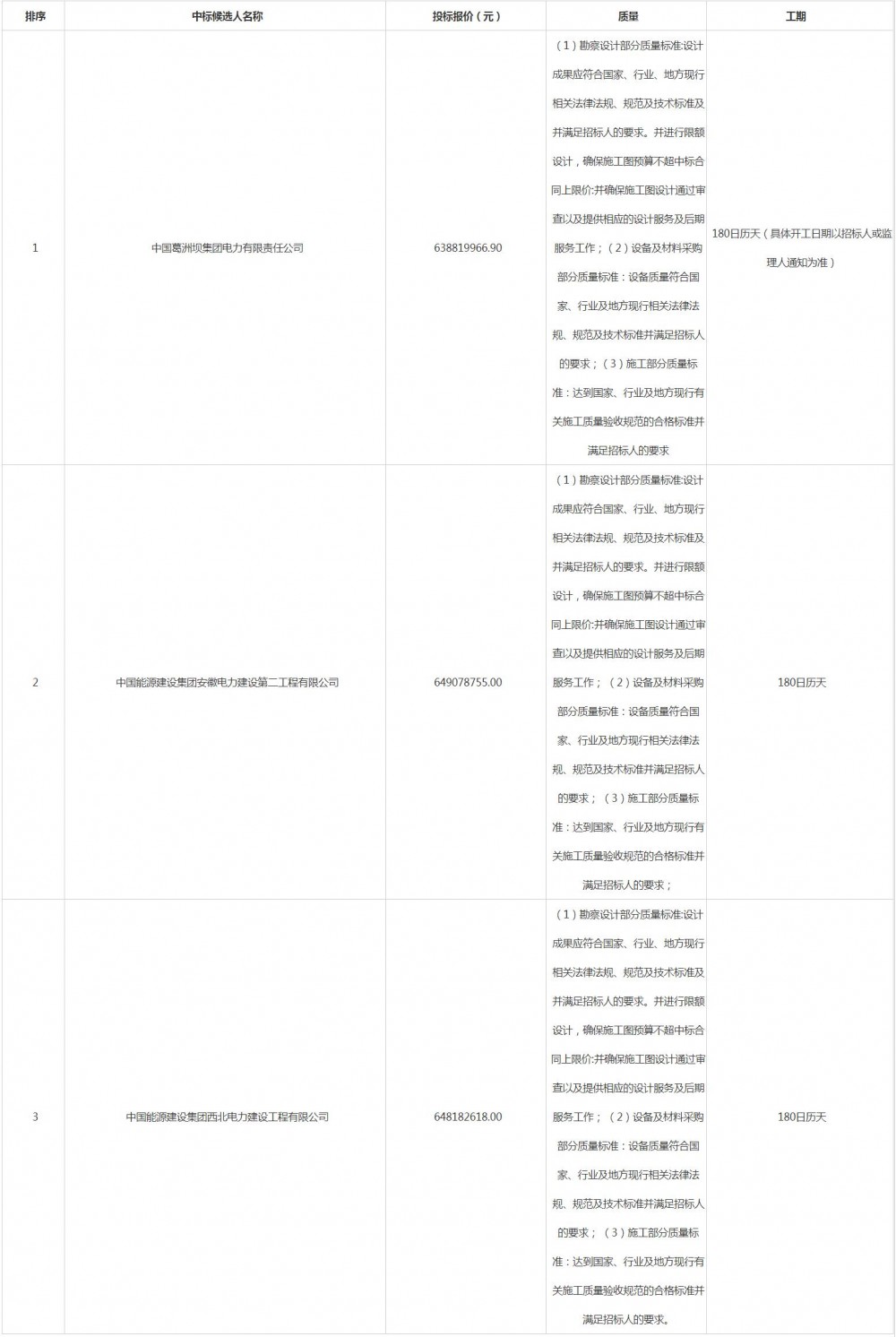 第一中标候选人为中国葛洲坝集团电力有限责任公司,投标报价638819966.90元;第二中标候选人为中国能源建设集团安徽电力建设第二工程有限公司,投标报价649078755.00元;第三中标候选人为中国能源建设集团西北电力建设工程有限公司,投标报价648182618.00元。