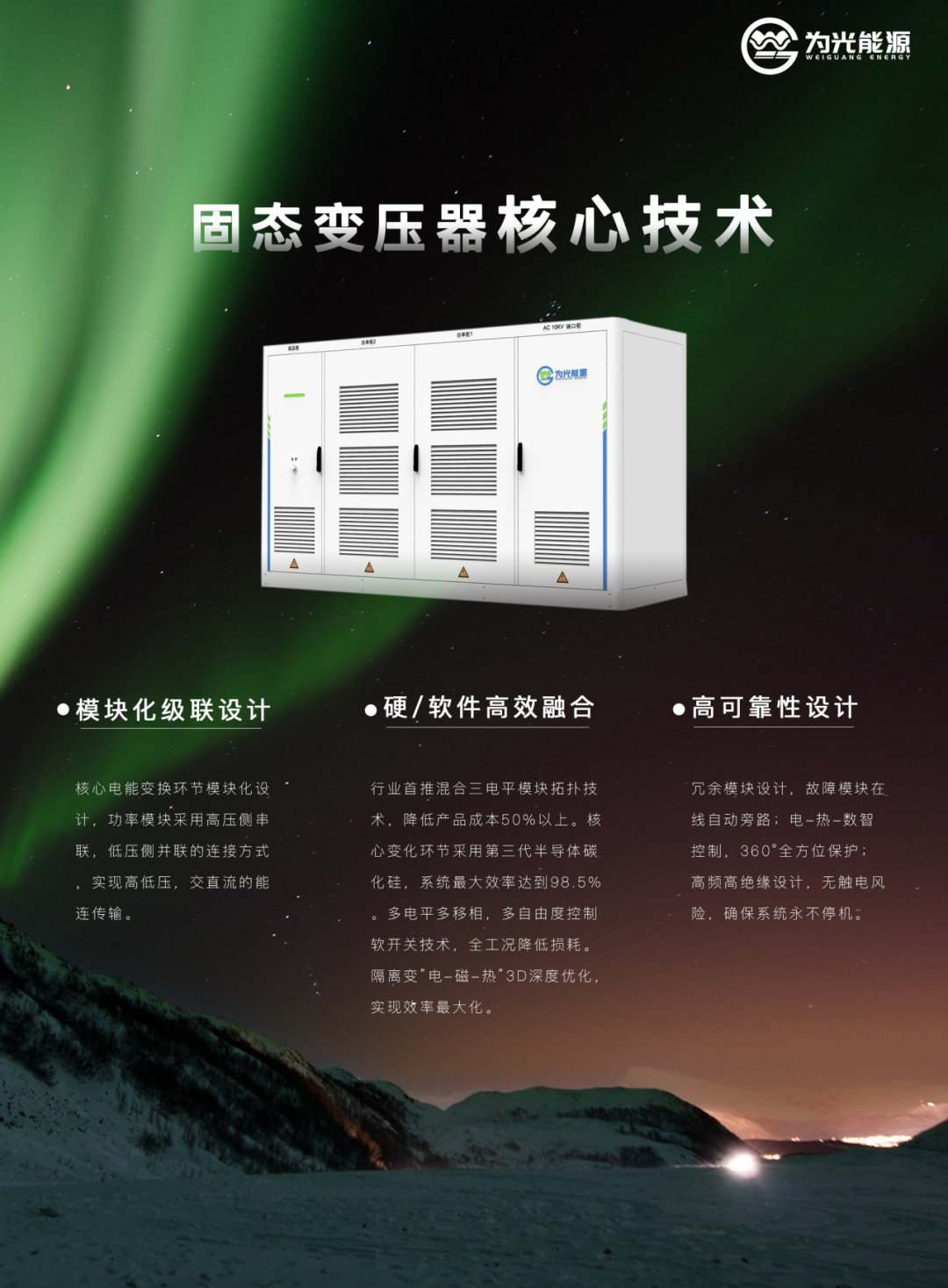 随着本次项目的成功交付,为光能源在西北地区综合能源应用领域又树立了新的标杆。作为西北地区首台套技术成果,它不仅展示了为光能源在以固态变压器(SST)为核心的电子电子装备技术领域的研发实力,更为西北地区新能源项目的技术选型提供了全新解决方案。