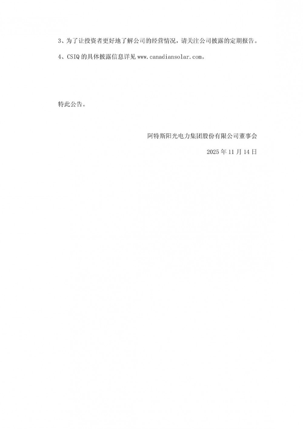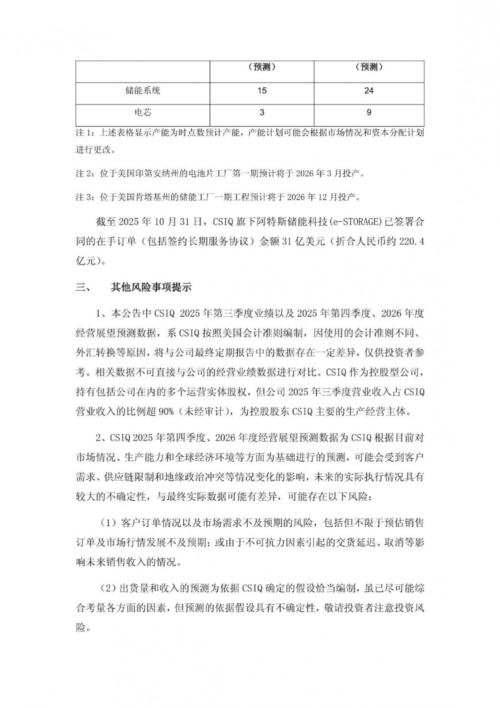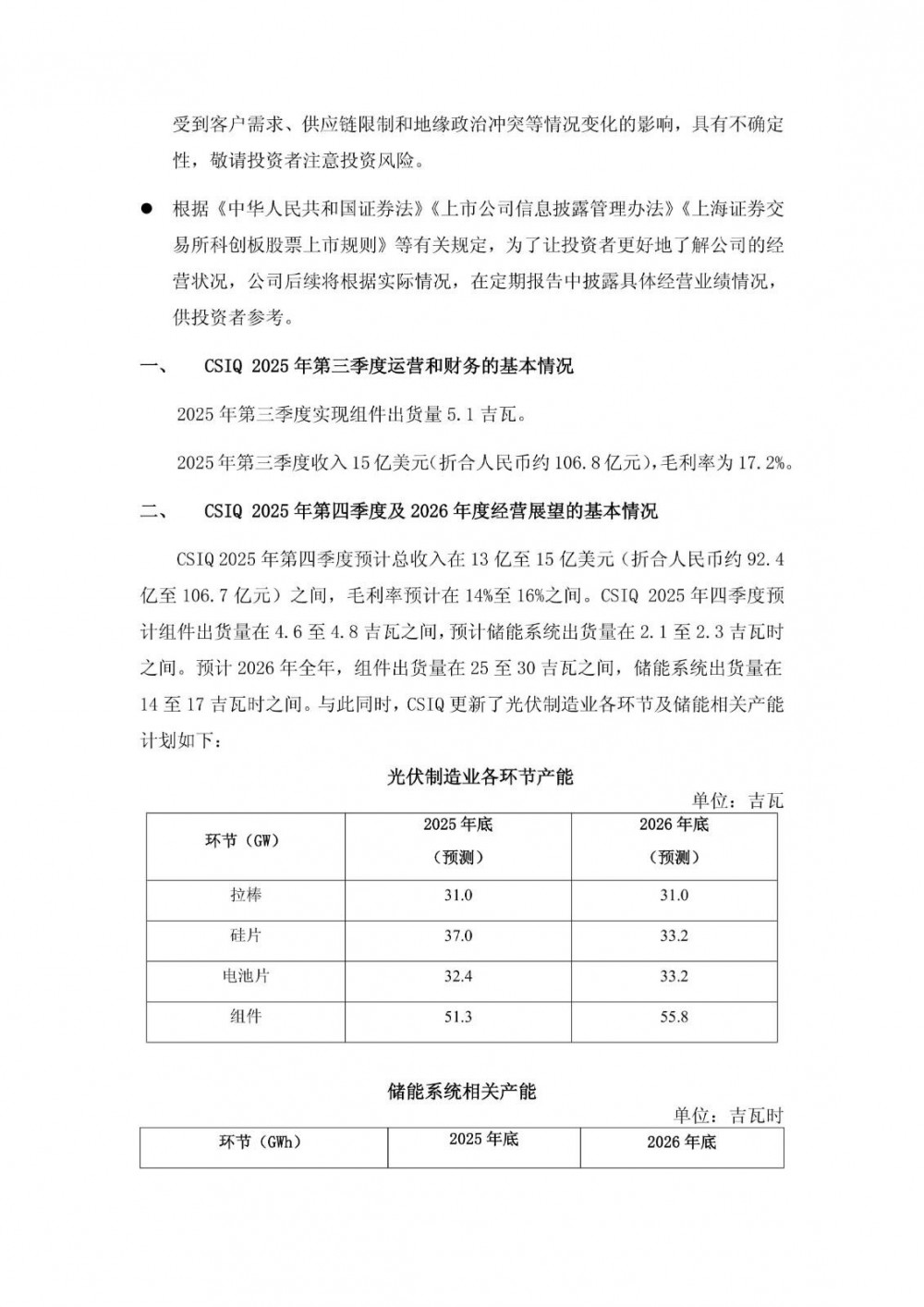 11月13日,阿特斯发布公告称,公司控股股东CSIQ预计2025年第四季度预计总收入在13亿至15亿美元(折合人民币约92.4亿至106.7亿元)之间,毛利率预计在14%至16%之间。CSIQ2025年四季度预计组件出货量在4.6至4.8吉瓦之间,预计储能系统出货量在2.1至2.3吉瓦时之间。