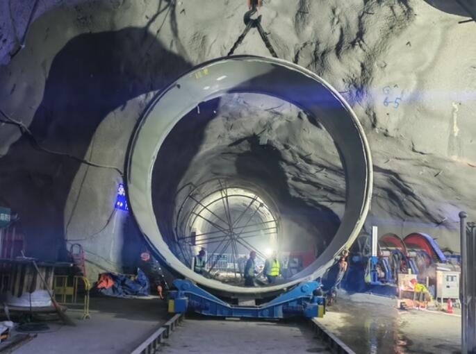 本次安装的压力钢管位于直径5.6米的下斜井段,是电站引水系统的核心组成部分。安装过程中,项目部制定了周密的专项施工方案。首先,采用“平板卡车+天锚+轨道运输台车”的组合方式进行钢管水平与斜井运输。精准运抵安装位置后,操作人员使用千斤顶将钢管顶升,并利用焊接托板等工艺措施,安全退出运输台车。随后,通过螺旋千斤顶精细调整钢管的中心、高程及倾斜度,遵循“先粗调后精调”的原则,在各项位置参数完全符合设计要求后,立即进行加固焊接,确保安装稳固。