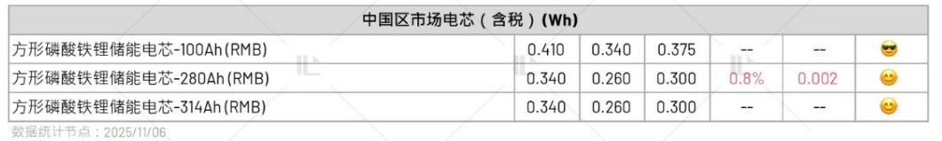 根据InfoLink Consulting最新市场数据,当前314Ah方形磷酸铁锂储能电芯价格区间为0.26元-0.34元/Wh,均价约0.3元/Wh;280Ah、100Ah电芯均价分别约为0.375元/Wh、0.3元/Wh,环比均略升,行业机构发布的研究报告显示,主流电芯厂商价格也环比上调0.02–0.03元/Wh。