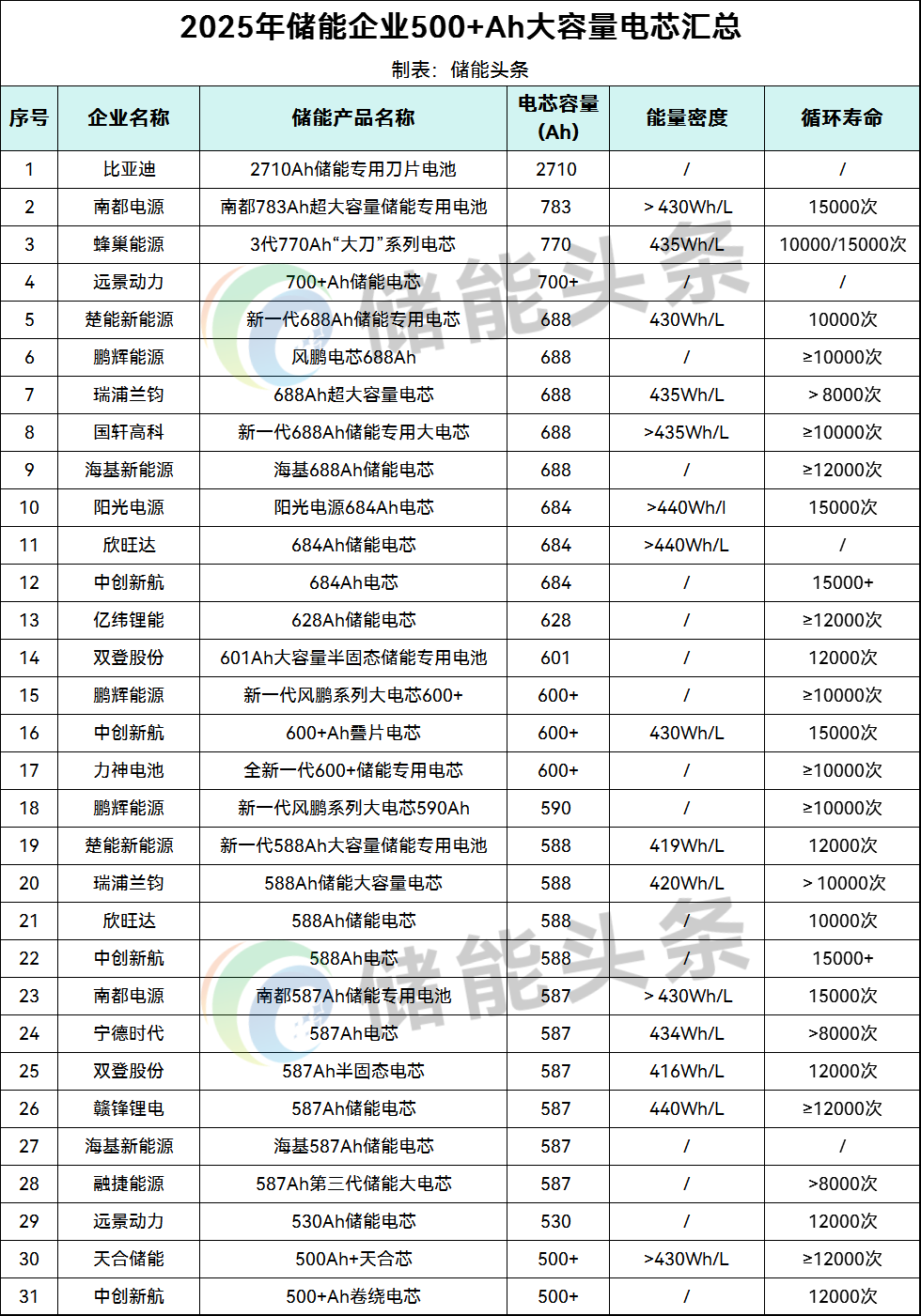 大容量迭代成为研发竞争的主战场。从300+Ah到500Ah+的跨越仅用两年,2025年19家企业密集发布的31款500+Ah大容量电芯新品中,600Ah以上容量占比达55%,最高容量已突破2710Ah。