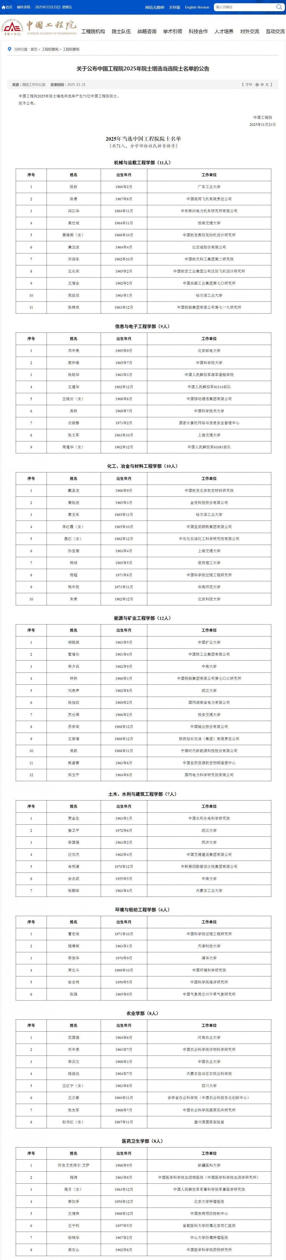 中国科学院、中国工程院11月21日公布2025年院士增选结果,分别选举产生中国科学院院士73人,中国工程院院士71人,共计144名院士当选。
