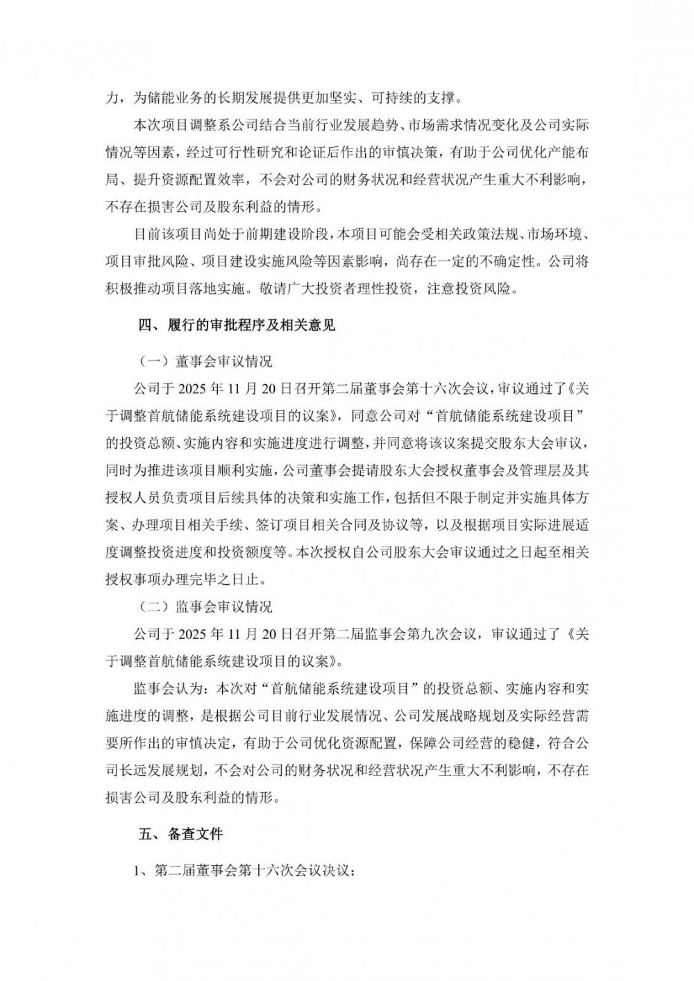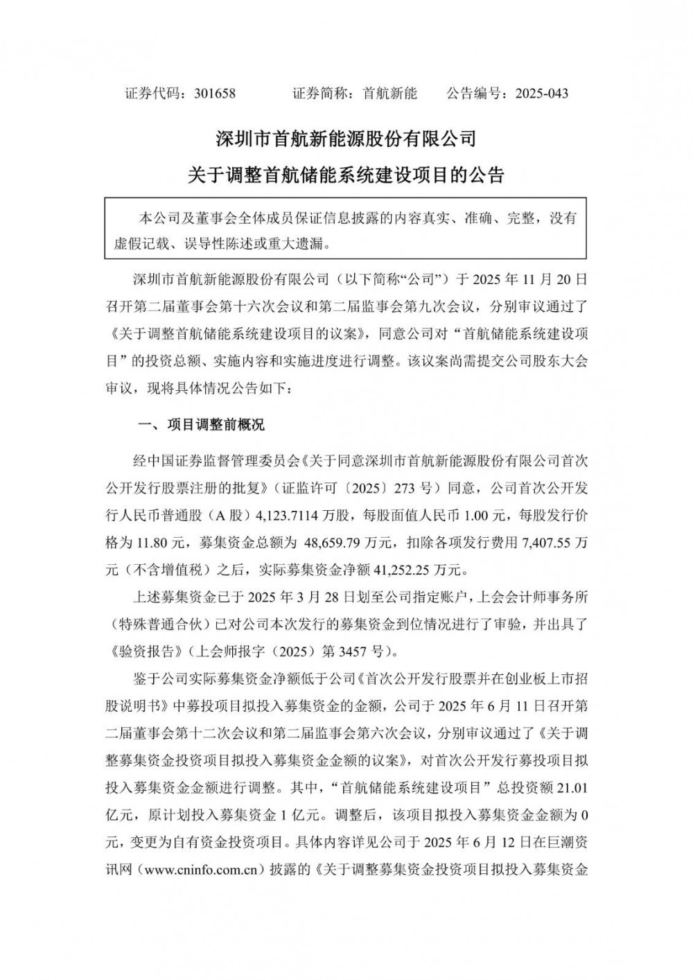 11月20日,首航新能发布公告称,基于对市场环境变化与公司实际情况的审慎评估,公司拟对“首航储能系统建设项目”的投资总额、实施内容和实施进度进行调整。“首航储能系统建设项目”投资总额拟由21.01亿元调整为12.10亿元,项目建设周期拟由24个月调整至40个月。