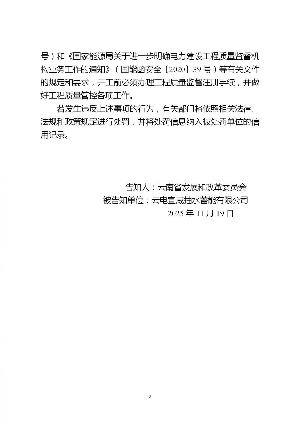 一、为贯彻落实国家能源安全新战略,加快规划建设新型能源体系,合理布局、积极有序开发建设抽水蓄能电站,按照企业投资核准备案管理和有关法律法规的规定,同意建设云南宣威抽水蓄能电站项目(项目代码:2504-530000-04-01-842351)。项目单位为云电宣威抽水蓄能有限公司。