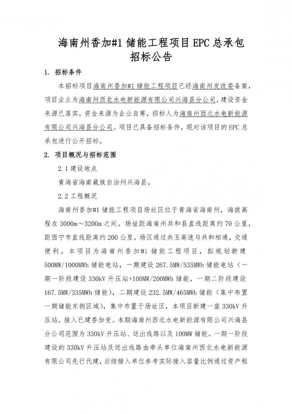 海南州香加#1储能工程项目场址区位于青海省海南州,海拔高程在3000m~3200m之间。场址距海南州共和县直线距离约70公里,距西宁市直线距离约200公里,场区通过共玉高速与共和相通,交通便利。本项目为海南州香加#1储能工程项目,拟规划新建500MW/1000MWh储能电站,一期建设267.5MW/535MWh储能电站(一期一阶段建设330kV升压站+100MW/200MWh储能,一期二阶段建设167.5MW/335MWh储能),二期建设232.5MW/465MWh储能(集中布置一期储能东侧区域),集中布置于场址区,本项目新建一座330kV升压站,接入已建香加变。本期海南州西北水电新能源有限公司兴海县分公司范围为330kV升压站、送出线路以及100MW储能。一期一阶段建设的330kV升压站及送出线路由牵头单位海南州西北水电新能源有限公司先行代建,后续接入单位参考实际接入容量比例通过资产租赁方式获取租赁权限。