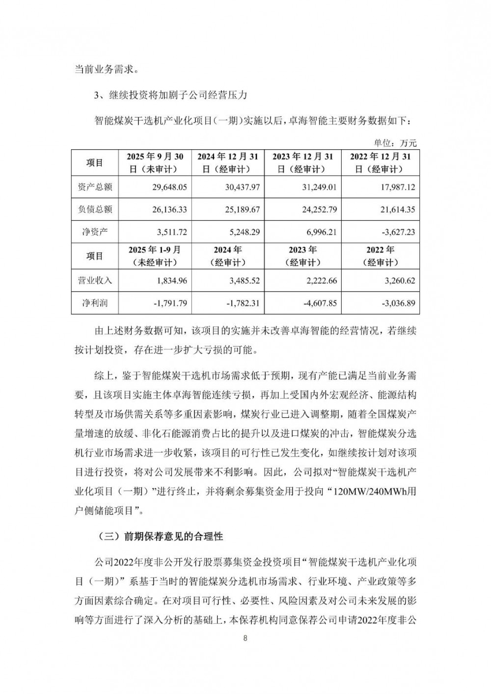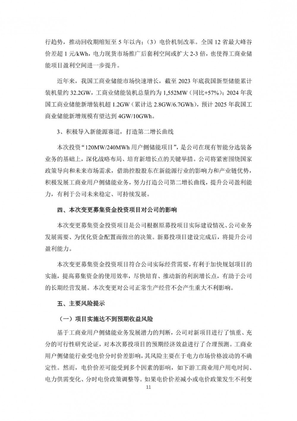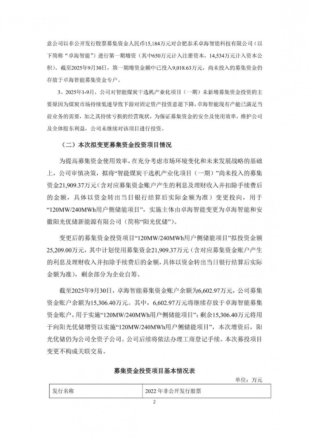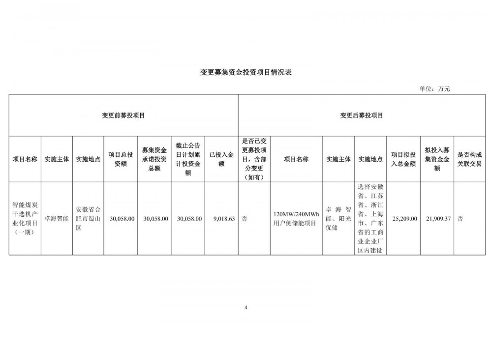 近日,泰禾智能发布公告称,为提高募集资金使用效率,在充分考虑市场环境变化和未来发展战略的基础上,公司审慎决策,拟将“智能煤炭干选机产业化项目(一期)”尚未投入的募集资金21,909.37万元(含对应募集资金账户产生的利息及理财收入并扣除手续费后的金额,具体以资金转出当日银行结算后实际金额为准)变更投向,用于“120MW/240MWh用户侧储能项目”,实施主体由卓海智能变更为卓海智能和安徽阳光优储新能源有限公司(简称“阳光优储”)。
