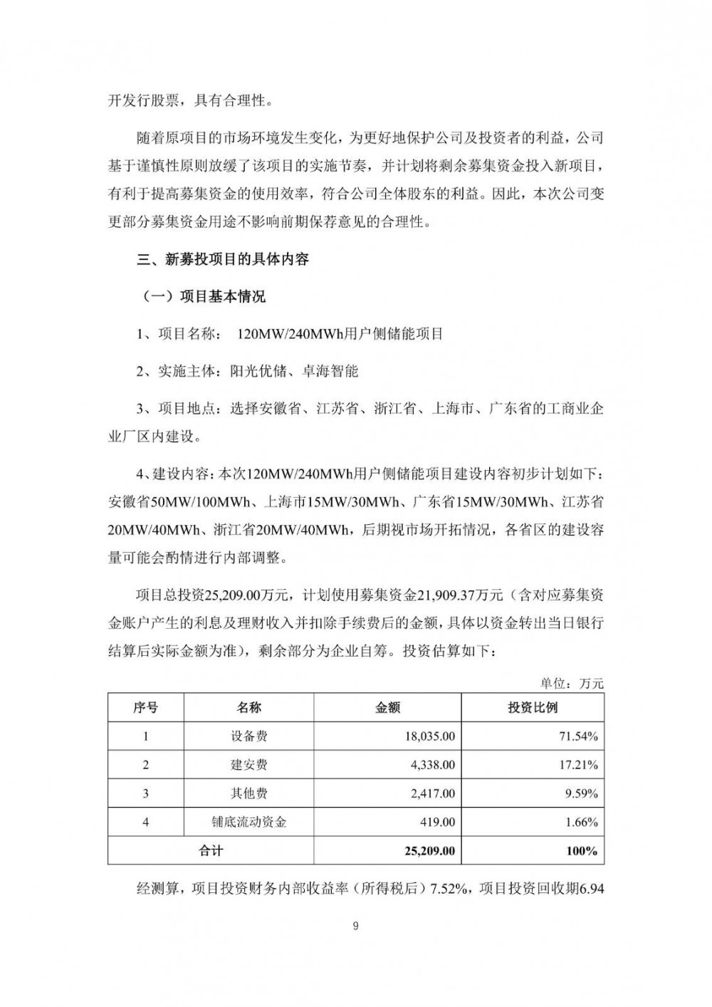 变更后的募集资金投资项目“120MW/240MWh用户侧储能项目”拟投资金额25,209.00万元,其中计划使用募集资金21,909.37万元(含对应募集资金账户产生的利息及理财收入并扣除手续费后的金额,具体以资金转出当日银行结算后实际金额为准),剩余部分为企业自筹。